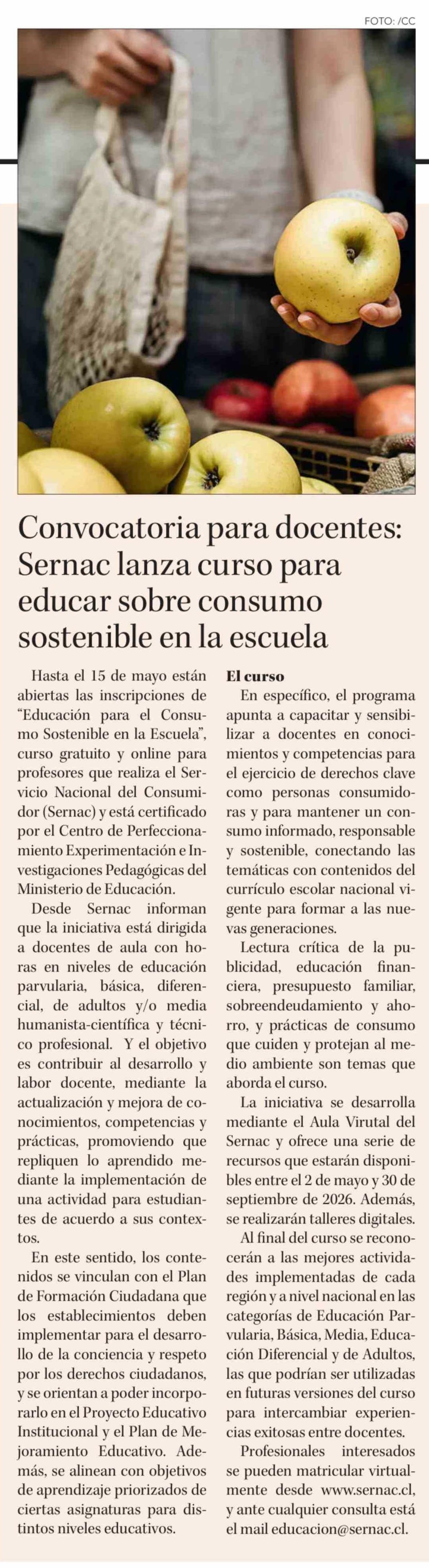 Convocatoria para docentes: Sernac lanza curso para educar sobre consumo sostenible en la escuela 17-04-2026 Diario Concepción |