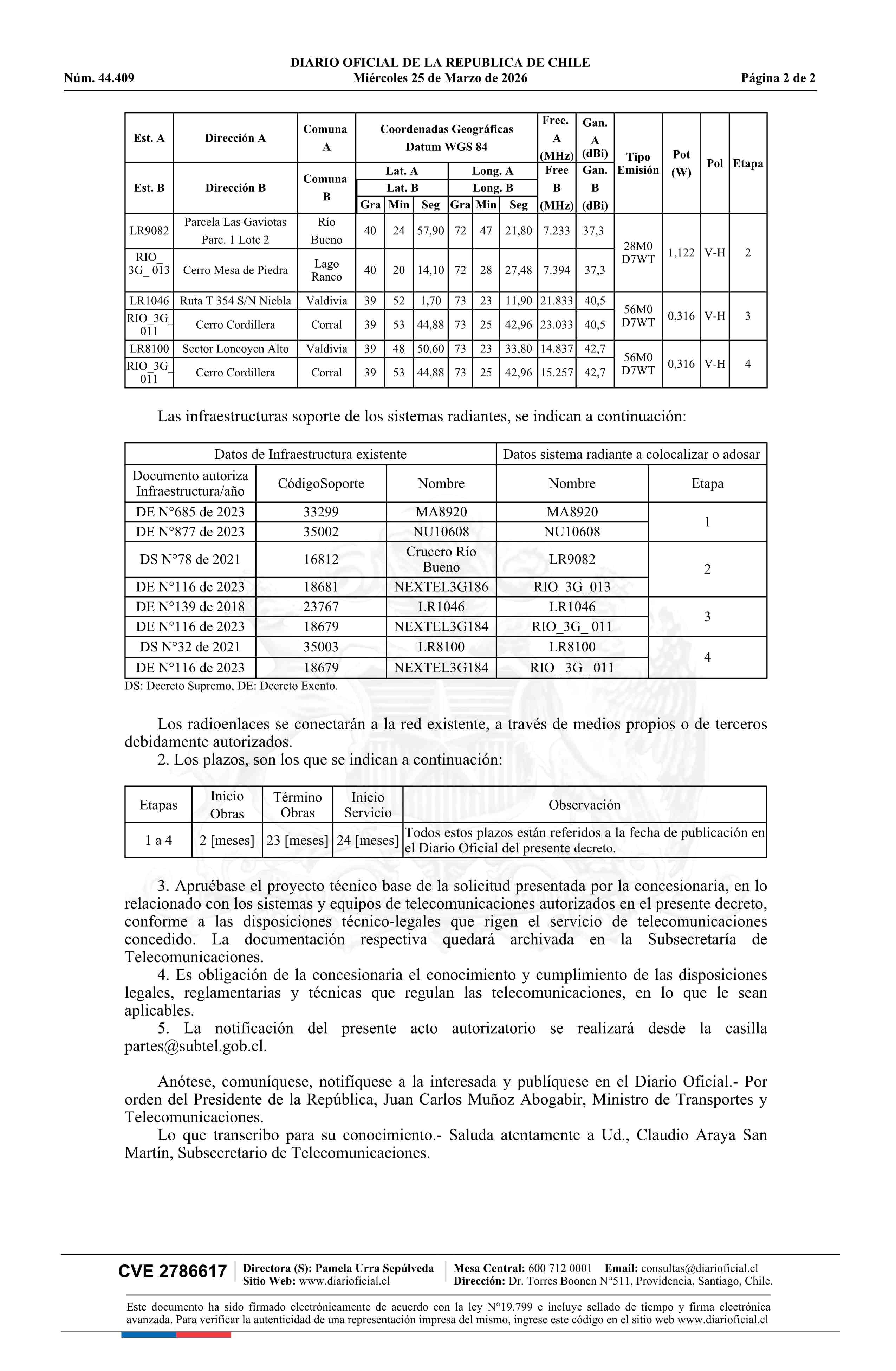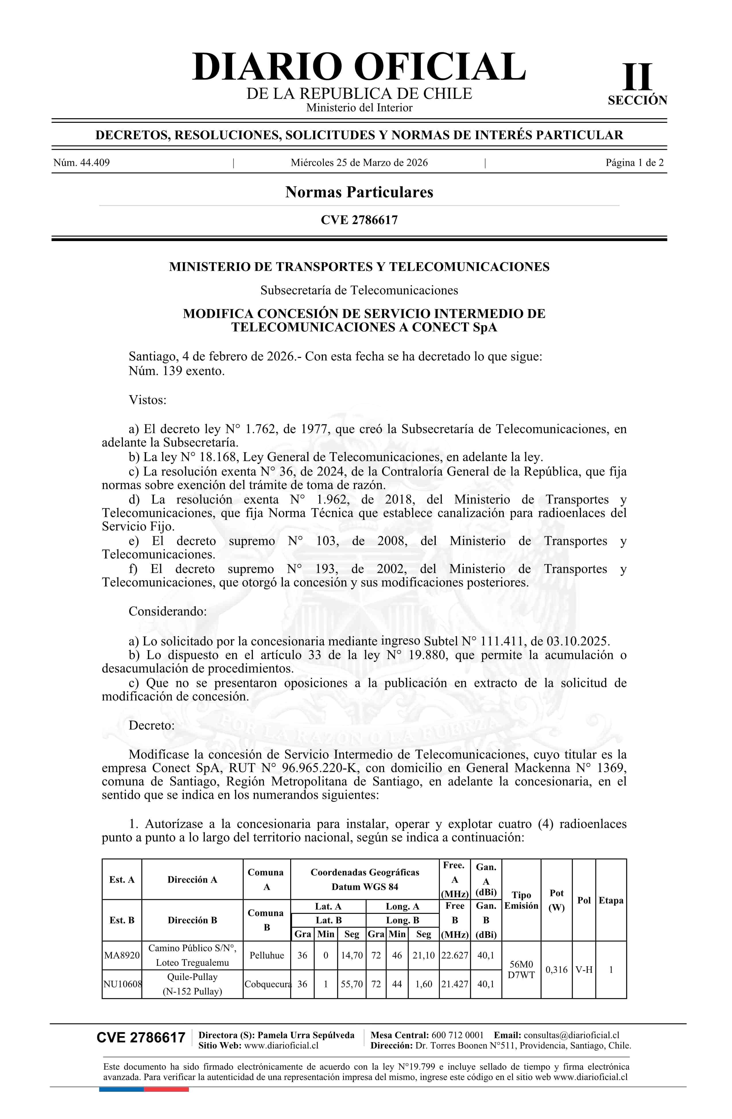 Decreto exento número 139, de 2026.- Modifica concesión de servicio intermedio de telecomunicaciones a Conect SpA 25-03-2026 Diario Oficial Edición Electrónica |