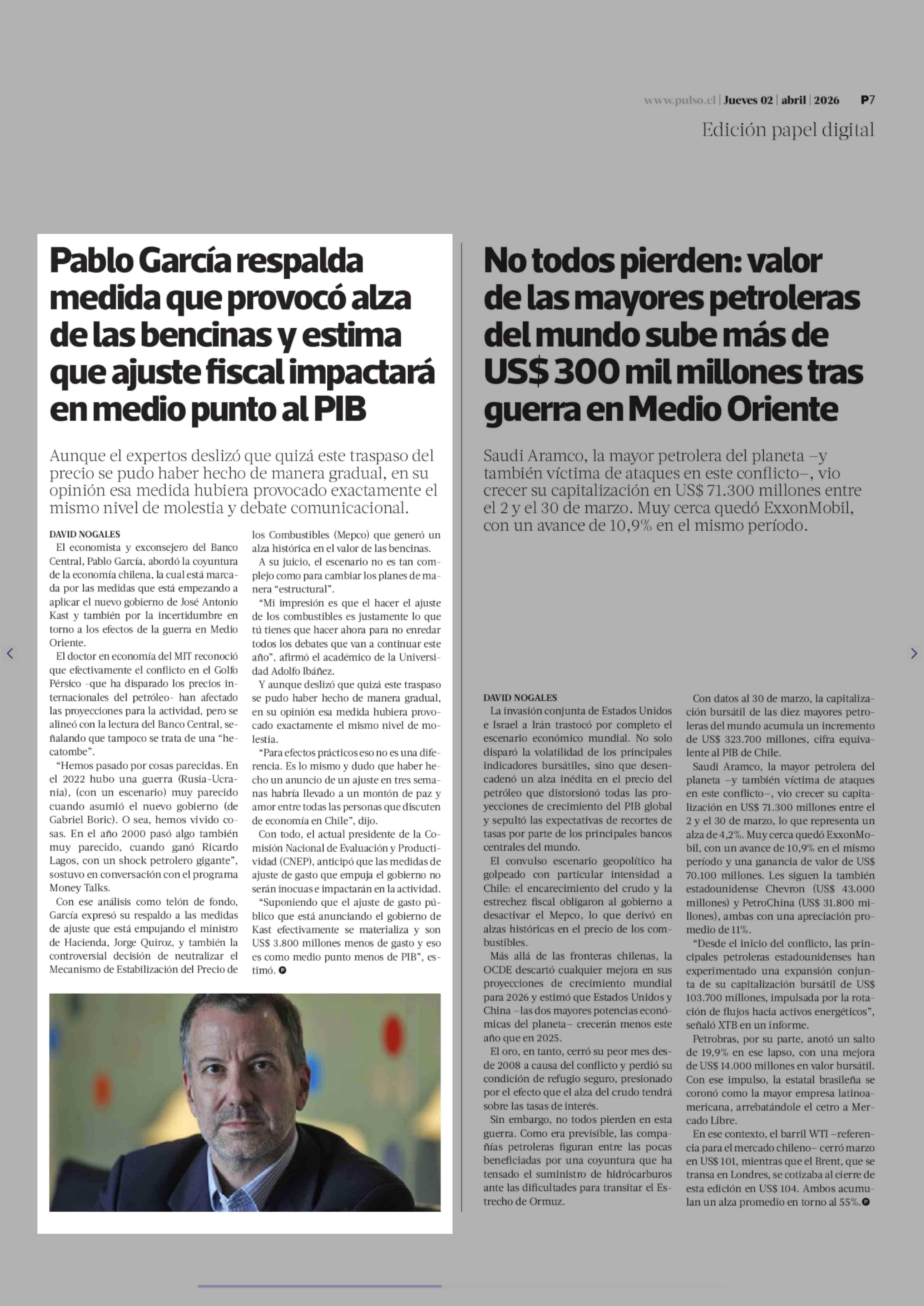 Pablo García respalda medida que provocó alza de las bencinas y estima que ajuste fiscal impactará en medio punto al PIB 02-04-2026 La Tercera |
