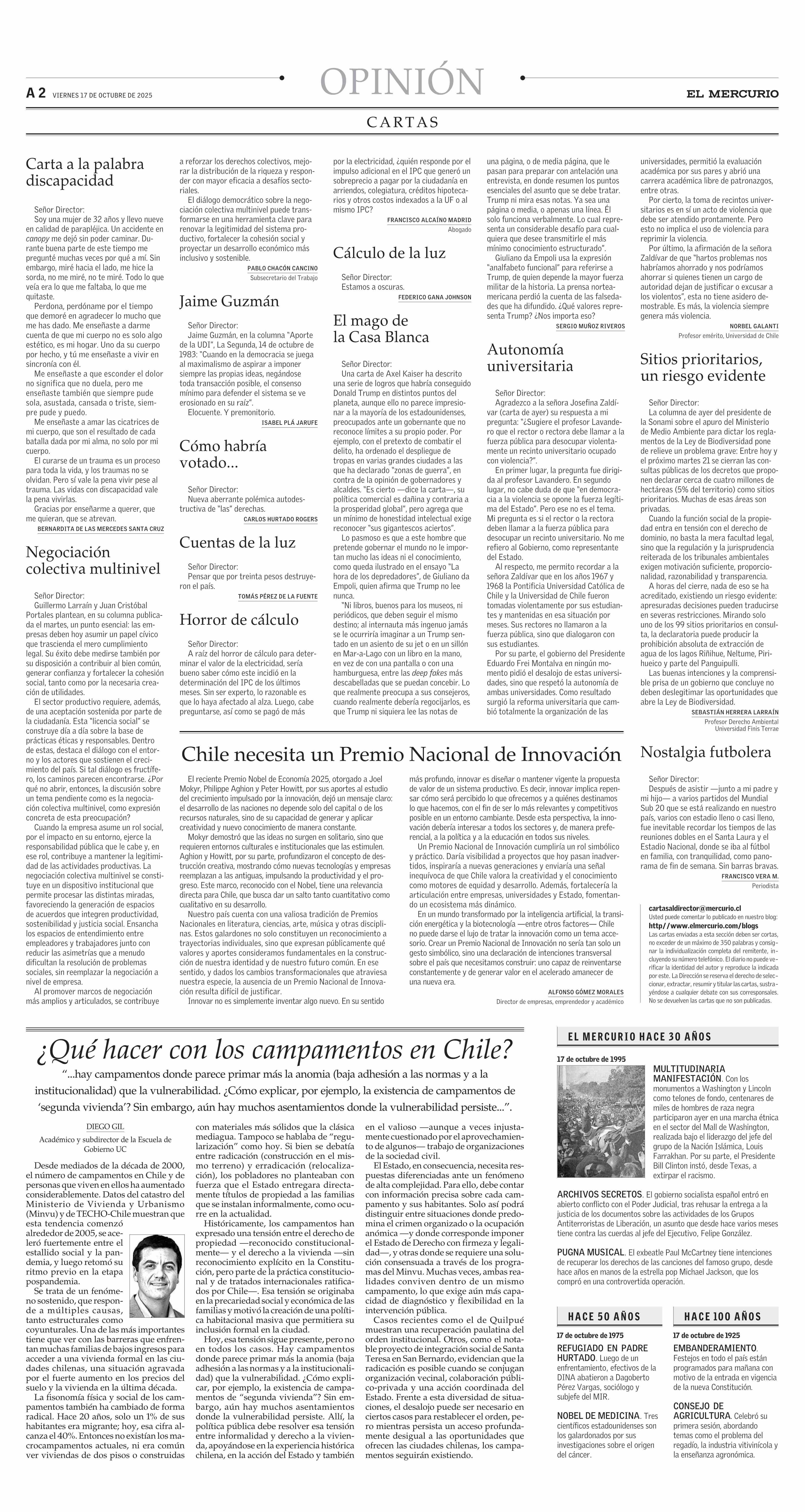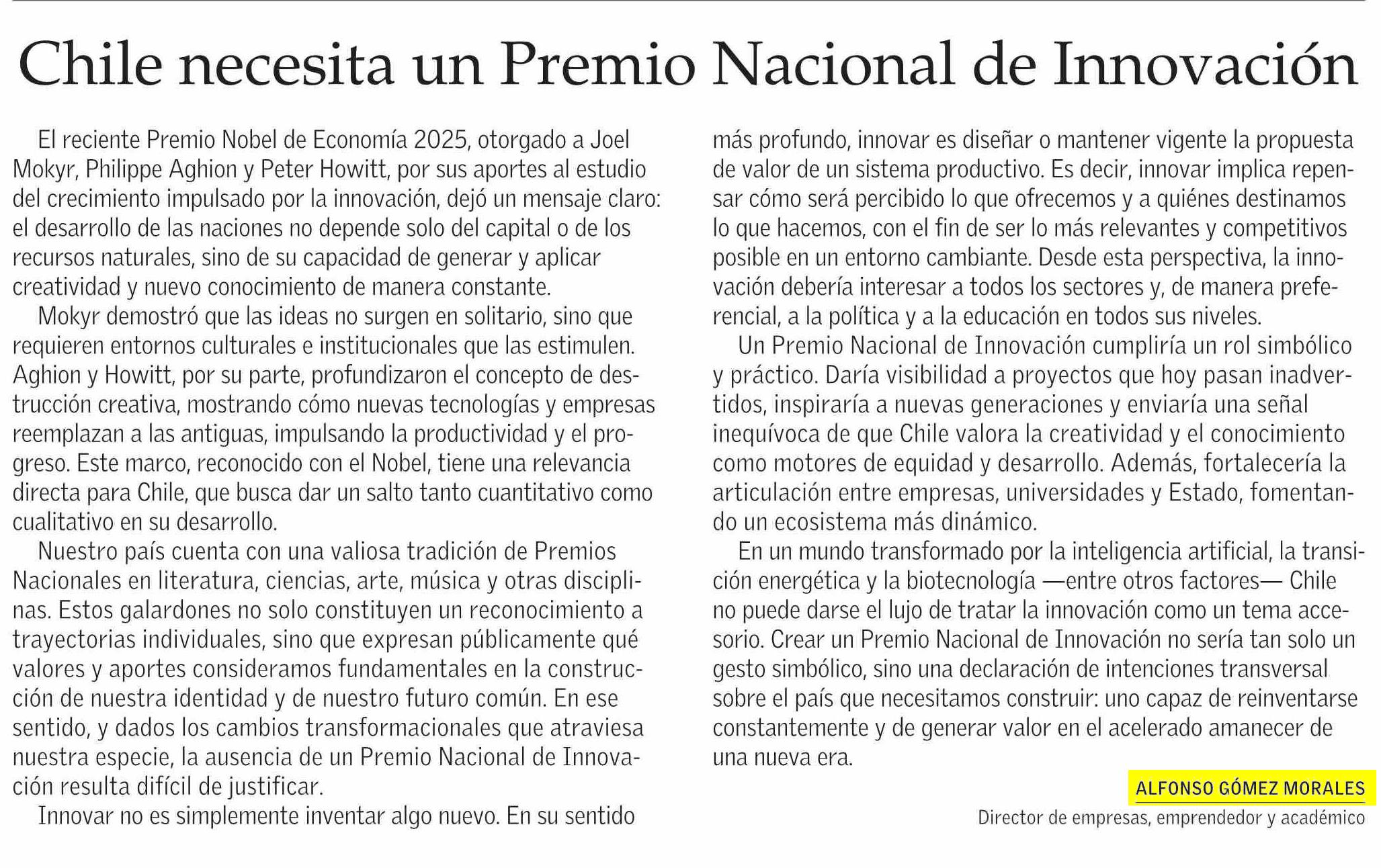 COLUMNAS DE OPINIÓN: Chile necesita un Premio Nacional de Innovación 17-10-2025 El Mercurio |