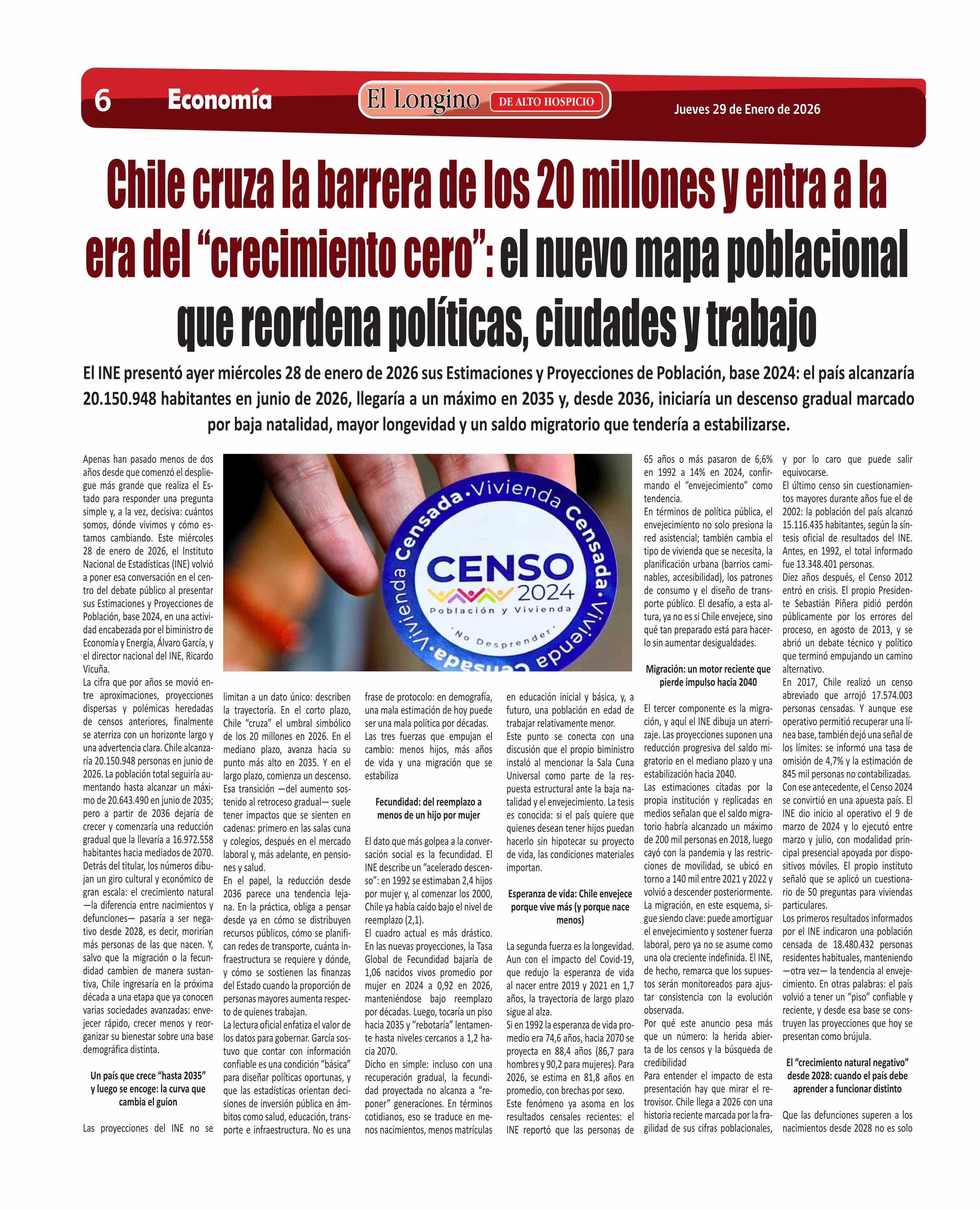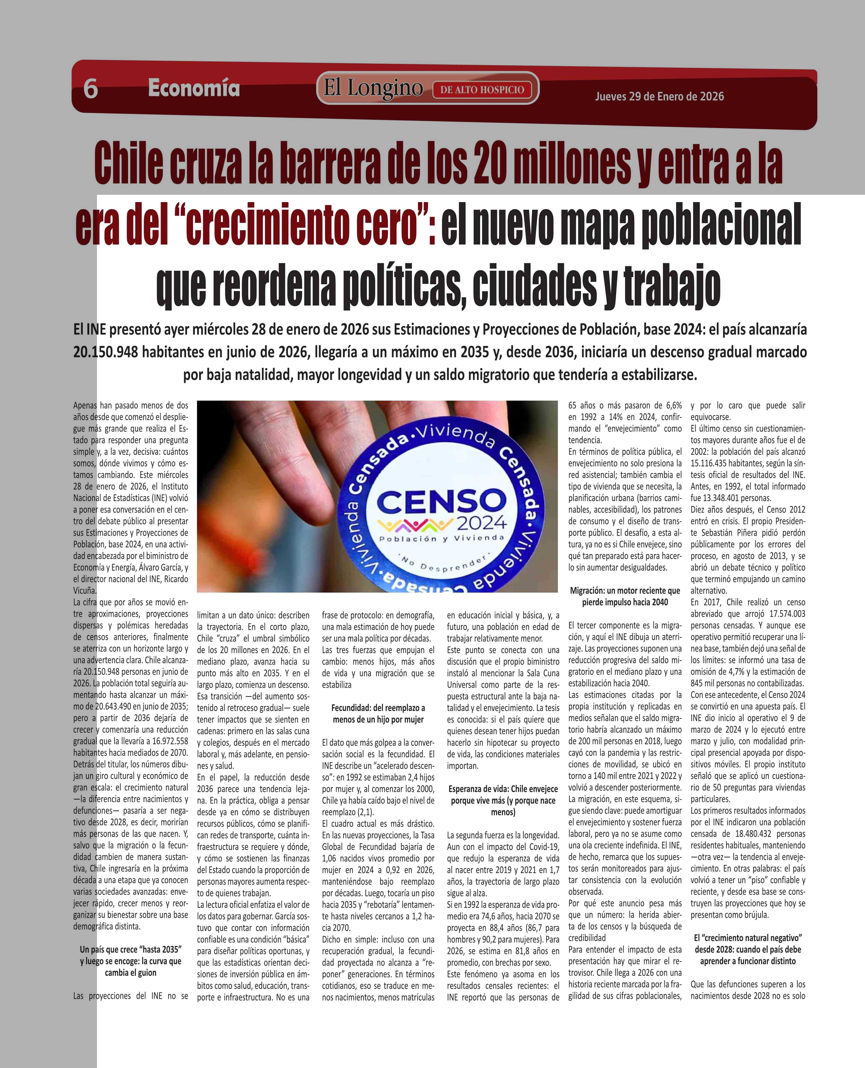 Chile cruza la barrera de los 20 millones y entra a la era del "crecimiento cero": el nuevo mapa poblacional que reordena políticas, ciudades y trabajo 29-01-2026 El Longino |
