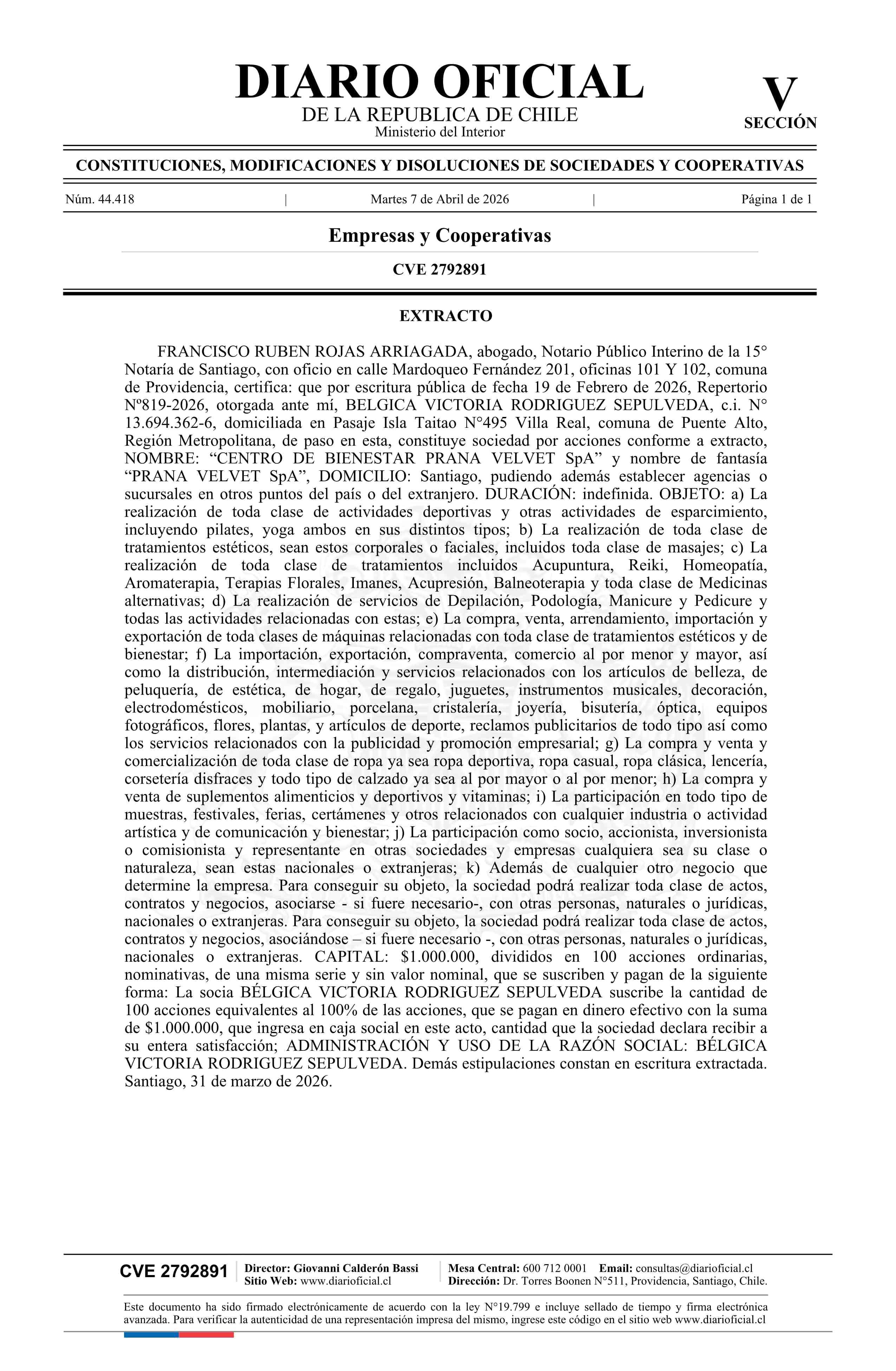 CENTRO DE BIENESTAR PRANA VELVET SpA 07-04-2026 Diario Oficial Edición Electrónica |