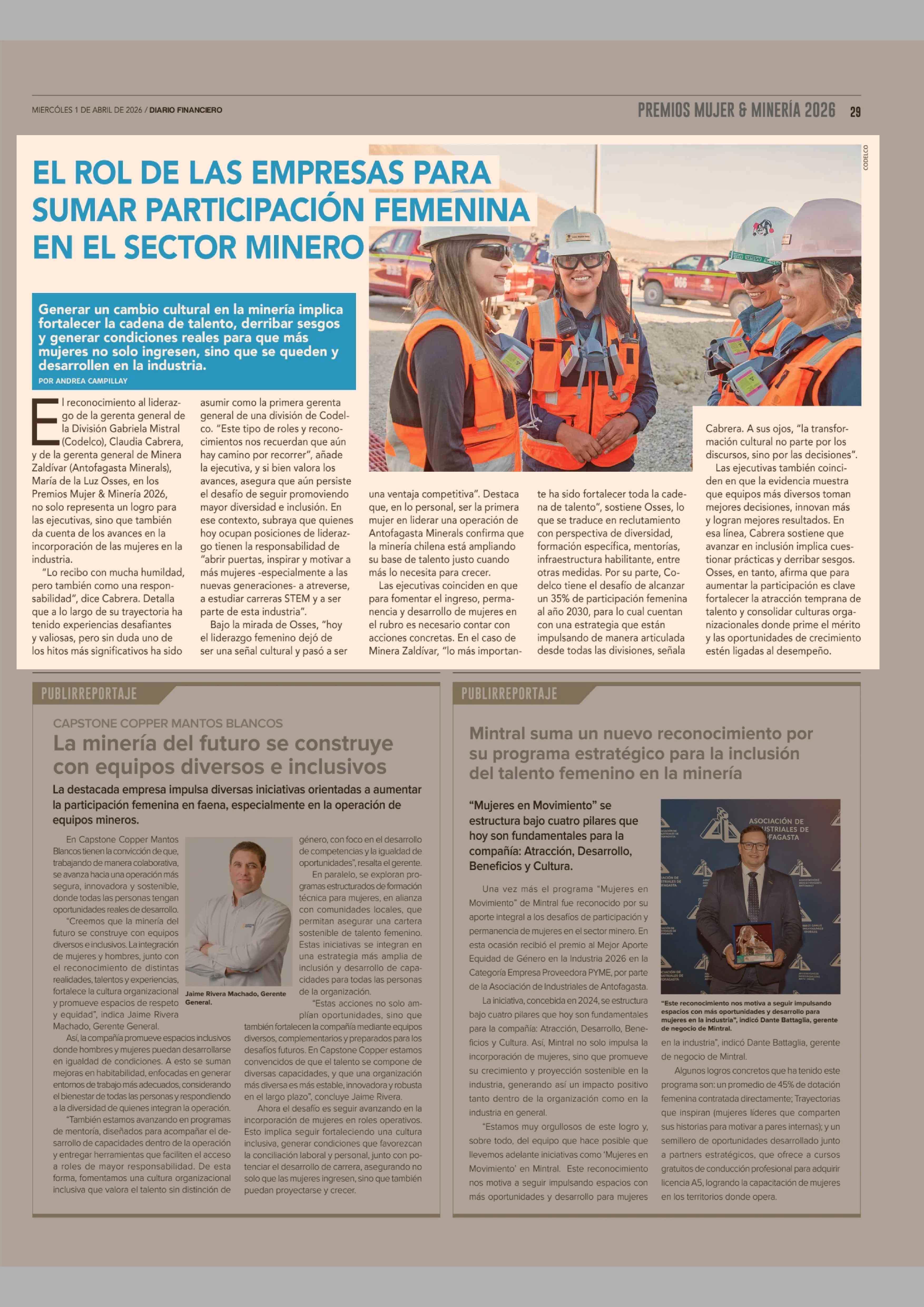 EL ROL DE LAS EMPRESAS PARA SUMAR PARTICIPACIÓN FEMENINA EN EL SECTOR MINERO 01-04-2026 Diario Financiero |