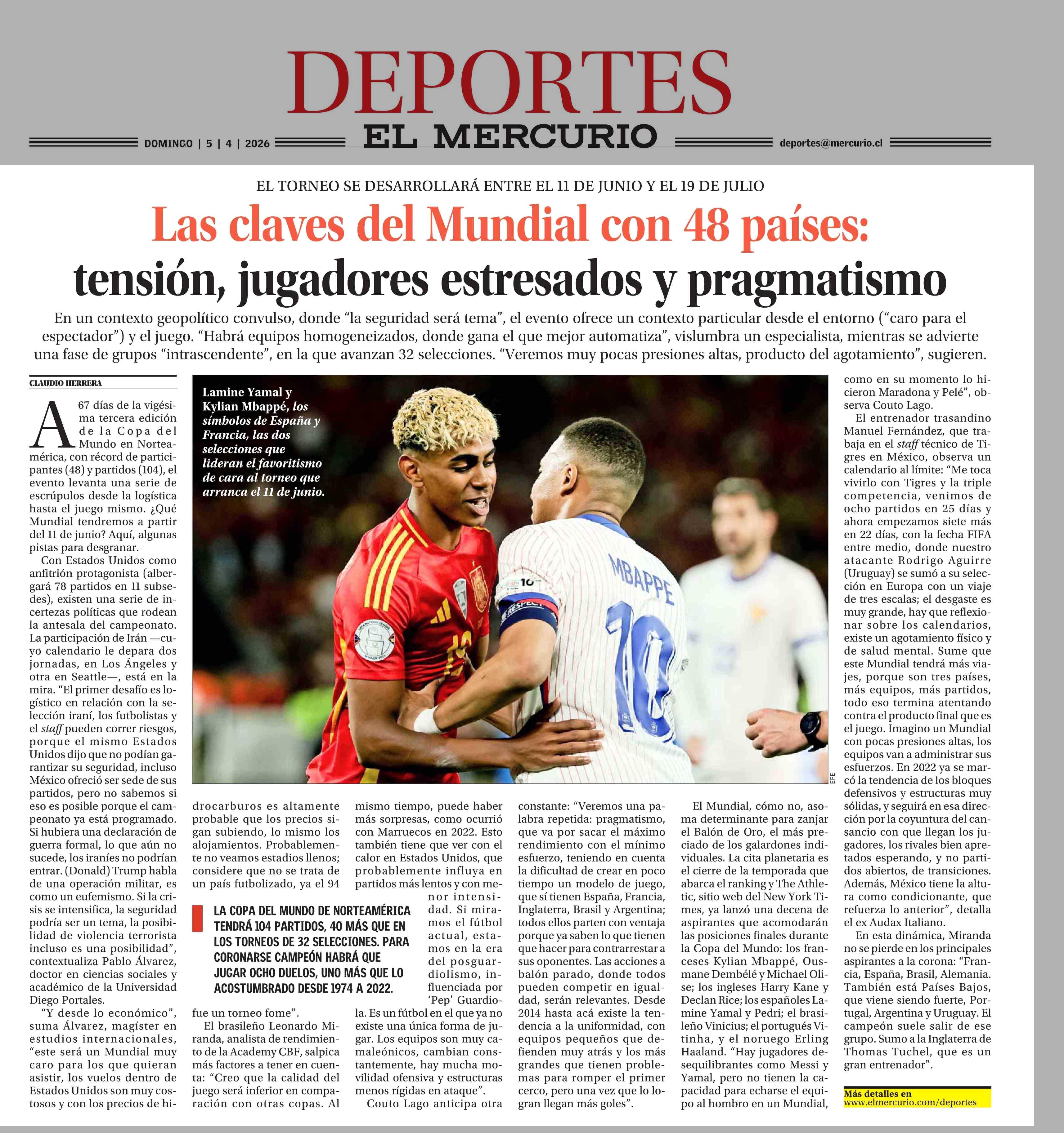 Las claves del Mundial con 48 países: tensión, jugadores estresados y pragmatismo 05-04-2026 El Mercurio |