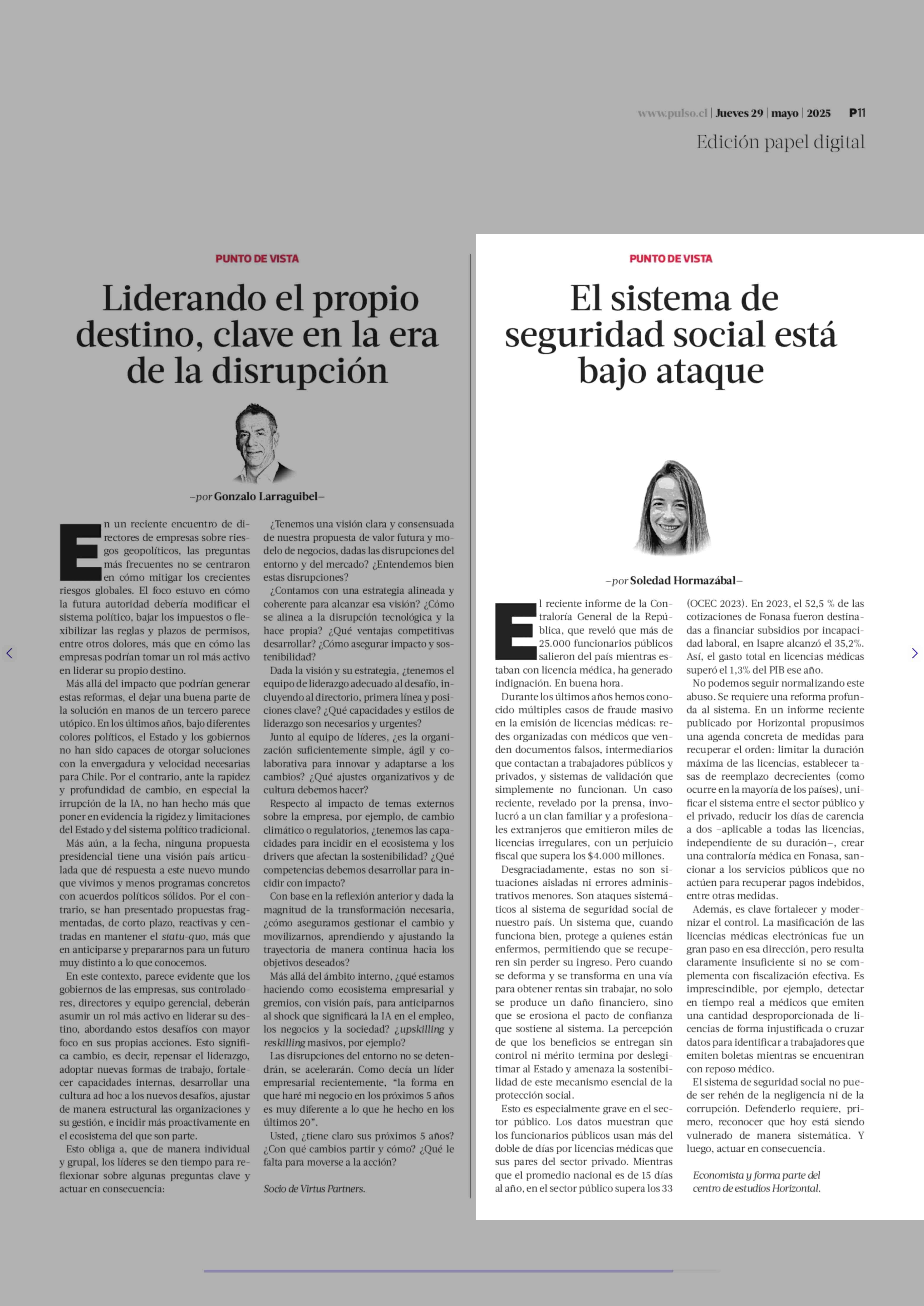 COLUMNAS DE OPINIÓN: El sistema de seguridad social está bajo ataque 29-05-2025 La Tercera |