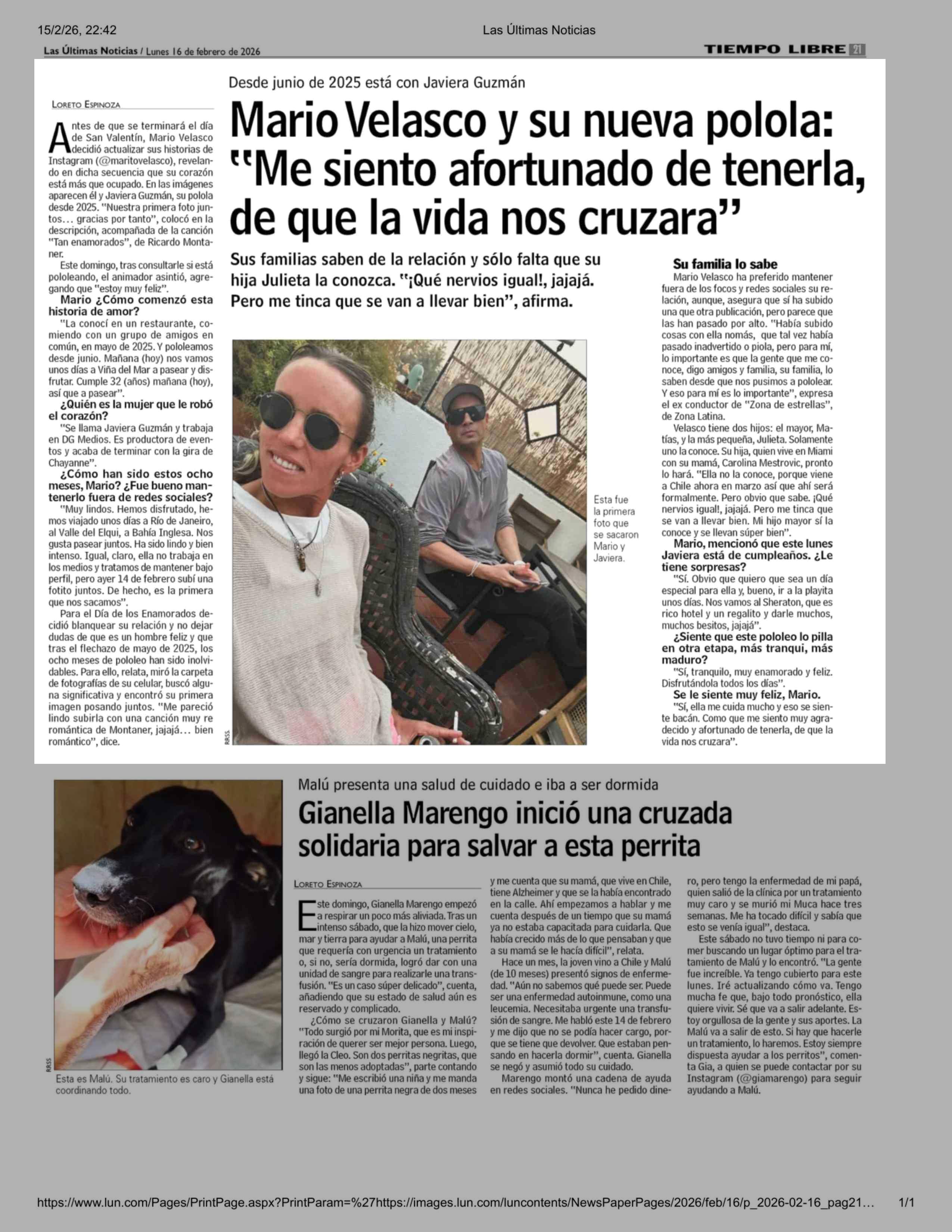Mario Velasco y su nueva polola: "Me siento afortunado de tenerla, de que la vida nos cruzara" 16-02-2026 Las Últimas Noticias |