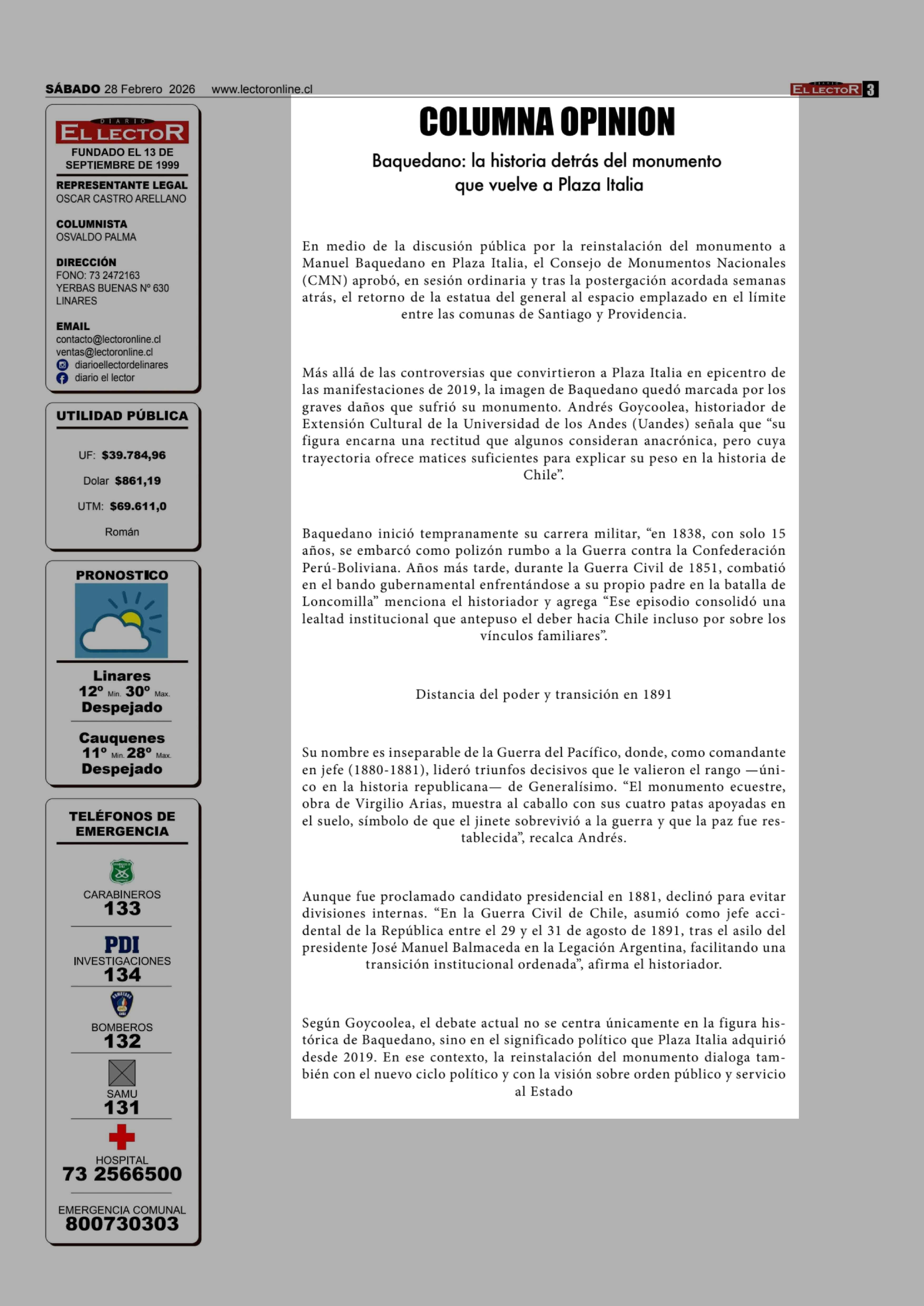 | Título: | Columnas de Opinión: En medio de la discusión pública por la reinstalación del monumento a Manuel Baquedano en Plaza Italia, el Consejo de Monumentos Nacionales (CMN) aprobó, en sesión ordinaria y tras la postergación acordada semanas atrás, el retorno de la estatua del general al espacio emplazado |