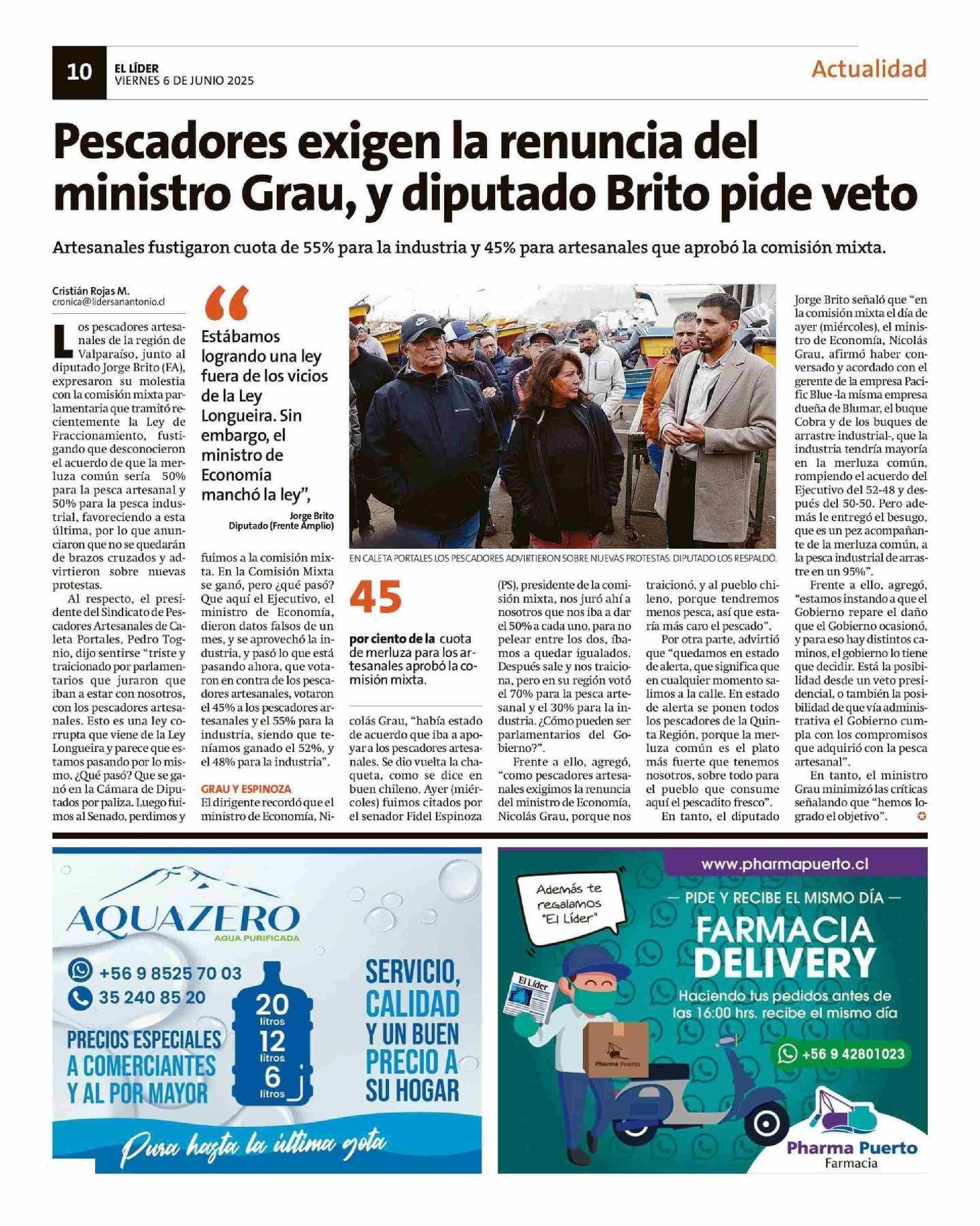 Título: Pescadores exigen la renuncia del ministro Grau, y diputado Brito pide veto