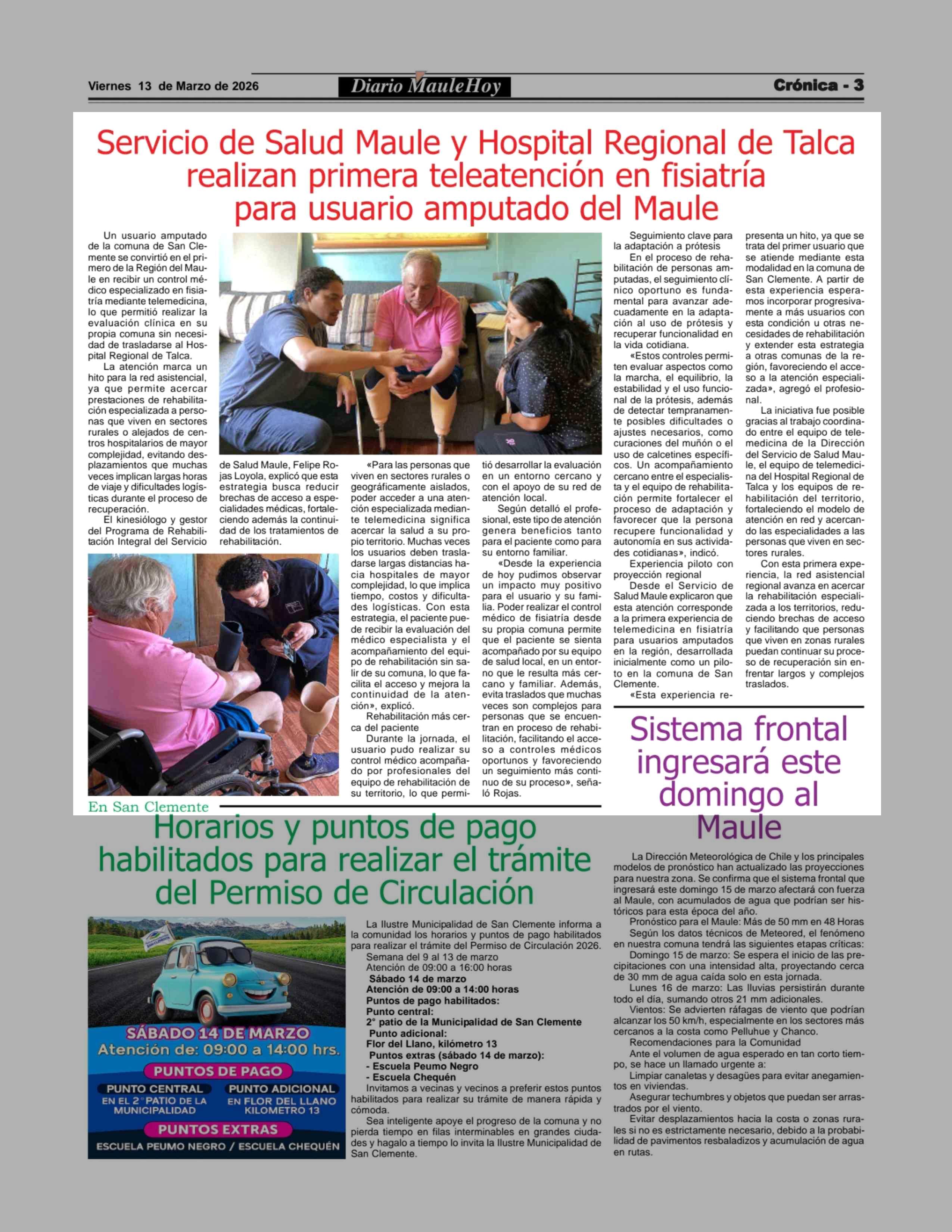 Servicio de Salud Maule y Hospital Regional de Talca realizan primera teleatención en fisiatria para usuario amputado del Maule 13-03-2026 Maule Hoy |