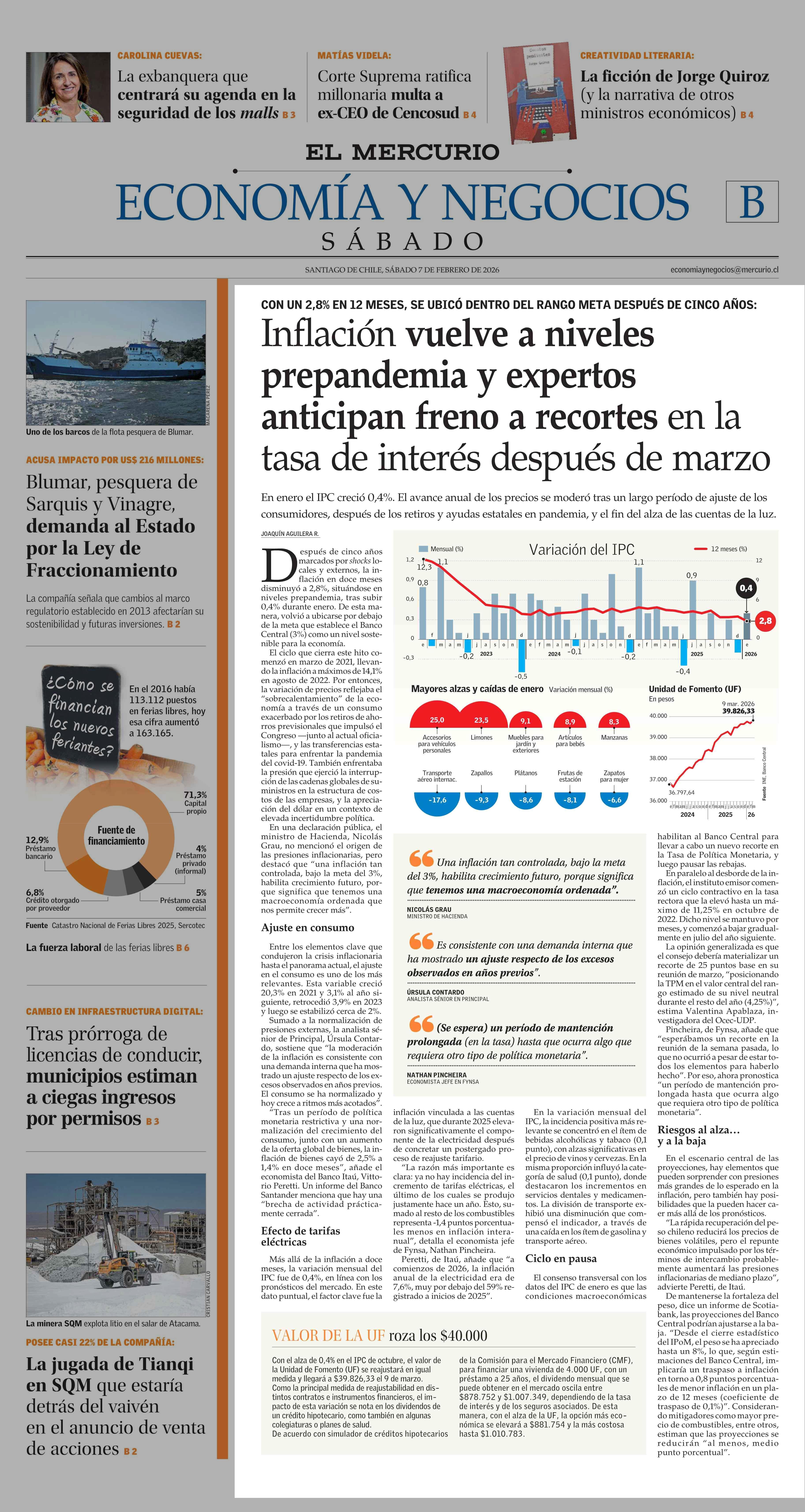Inflación vuelve a niveles prepandemia y expertos anticipan freno a recortes en la tasa de interés después de marzo 07-02-2026 El Mercurio |