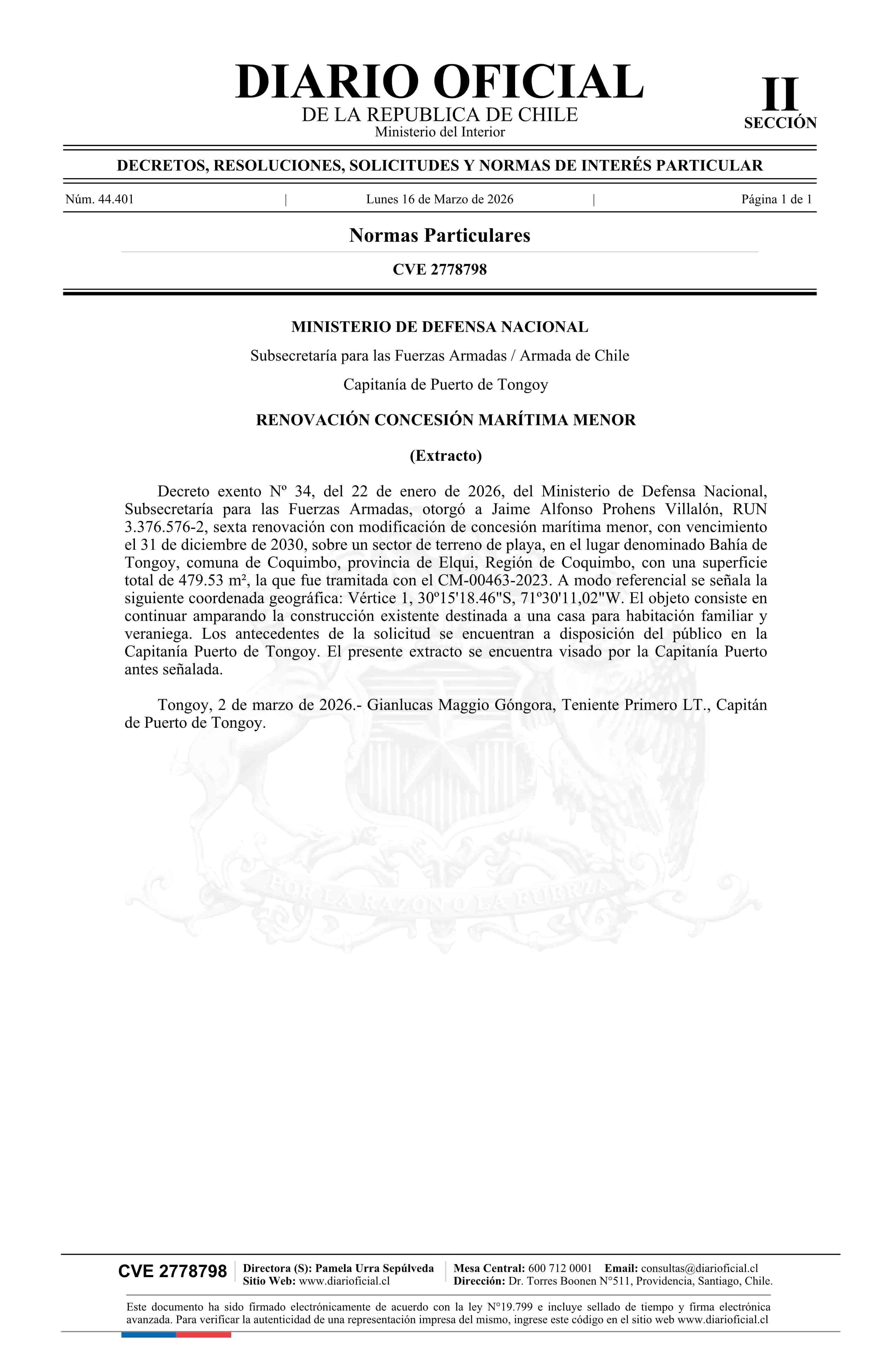 Extracto de decreto exento número 34, de 2026.- Renovación de concesión marítima menor 16-03-2026 Diario Oficial Edición Electrónica |
