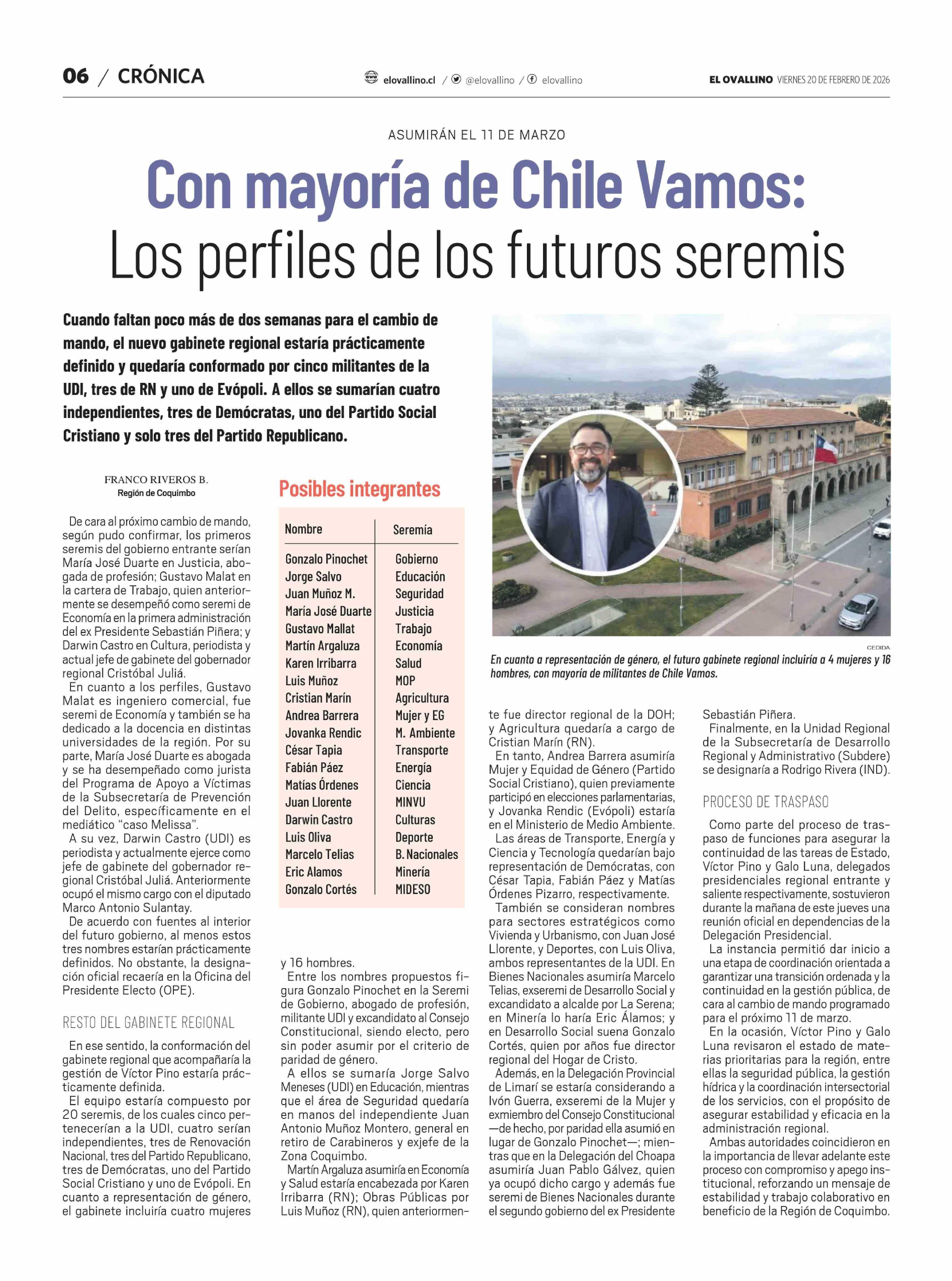 Con mayoría de Chile Vamos: Los perfiles de los futuros seremis 20-02-2026 El Ovallino |