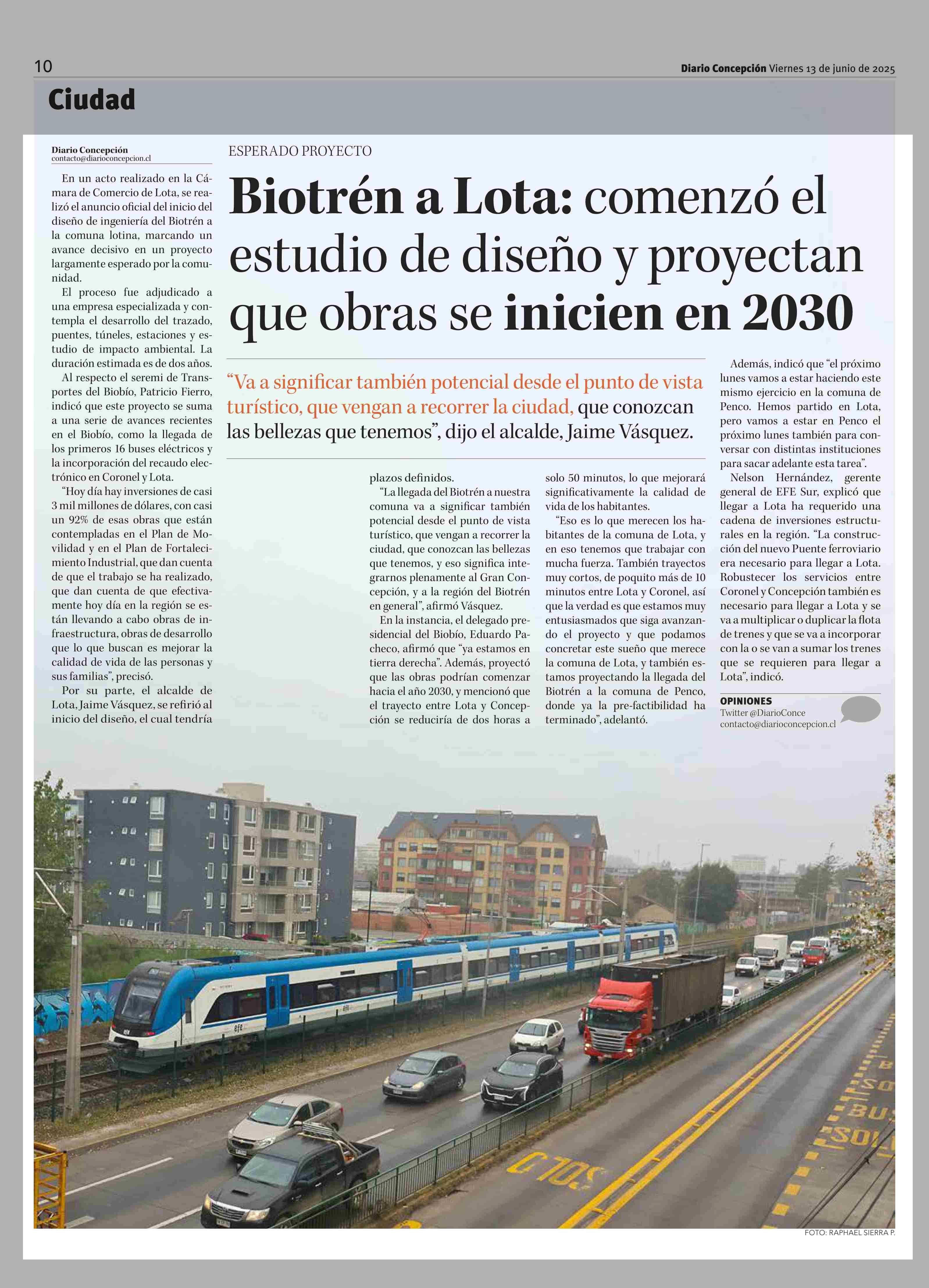Biotrén a Lota: comenzó el estudio de diseño y proyectan que obras se inicien en 2030 13-06-2025 Diario Concepción |