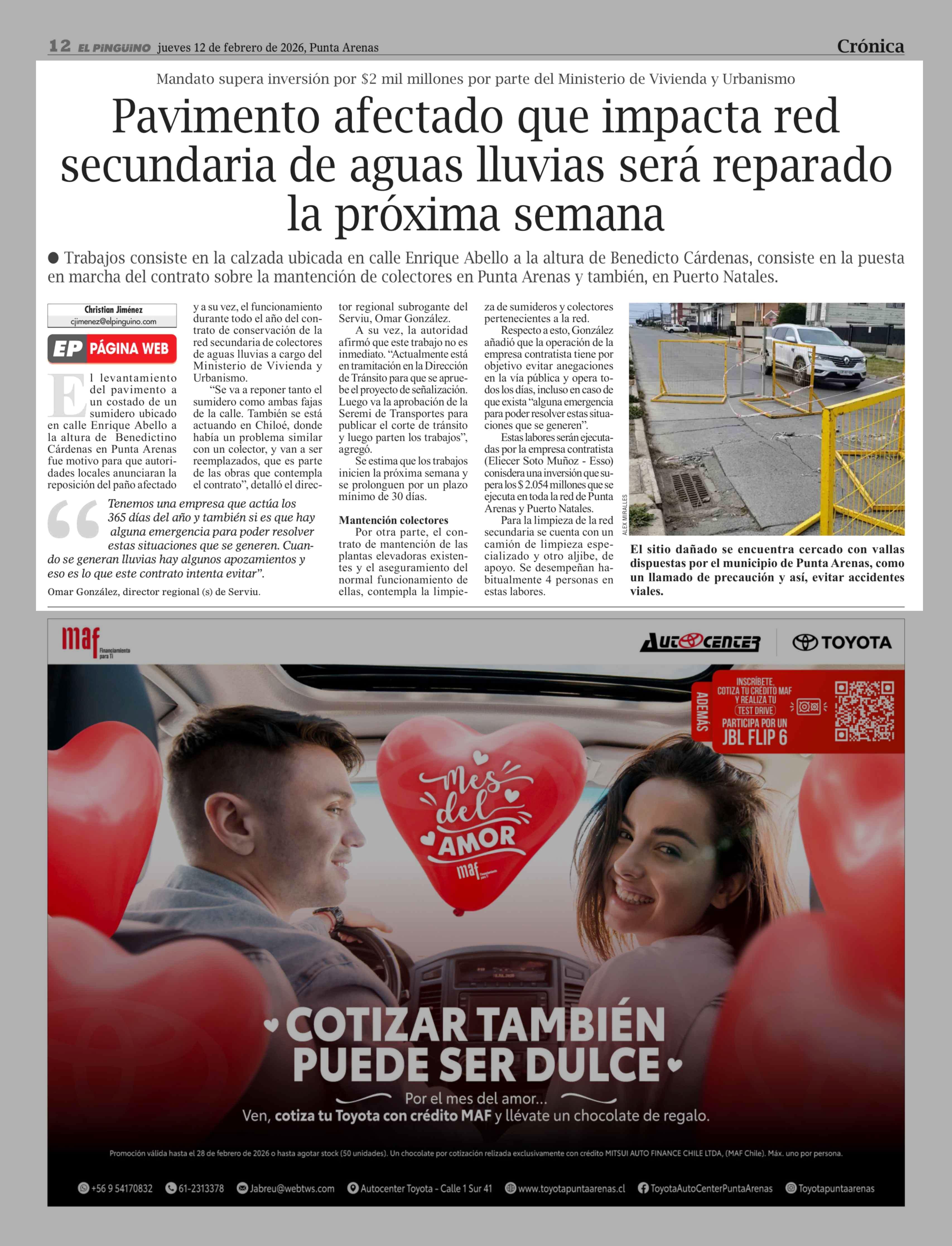 Pavimento afectado que impacta red secundaria de aguas lluvias será reparado la próxima semana 12-02-2026 El Pingüino |