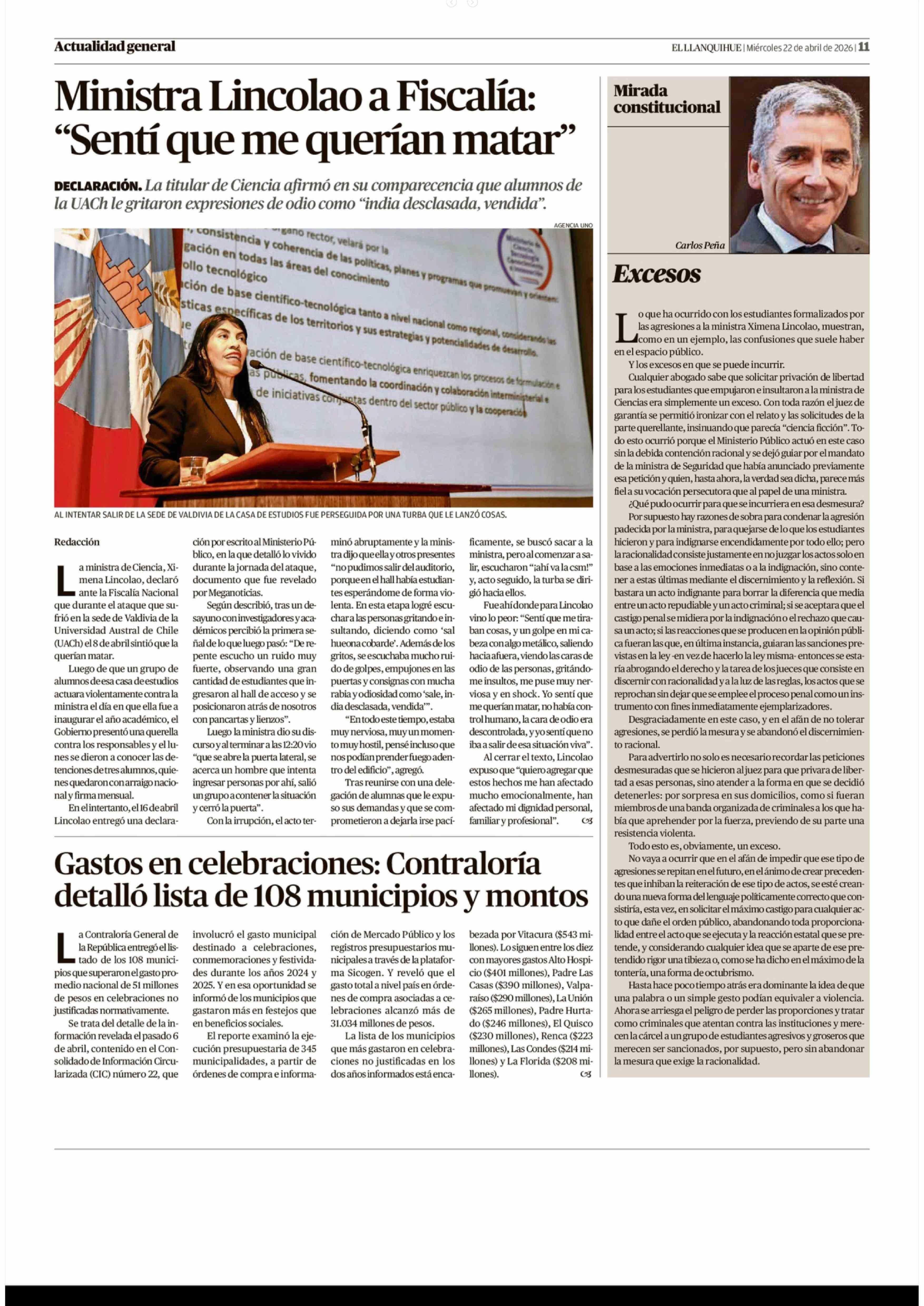 Ministra Lincolao a Fiscalía: "Sentí que me querían matar" 22-04-2026 El Llanquihue |