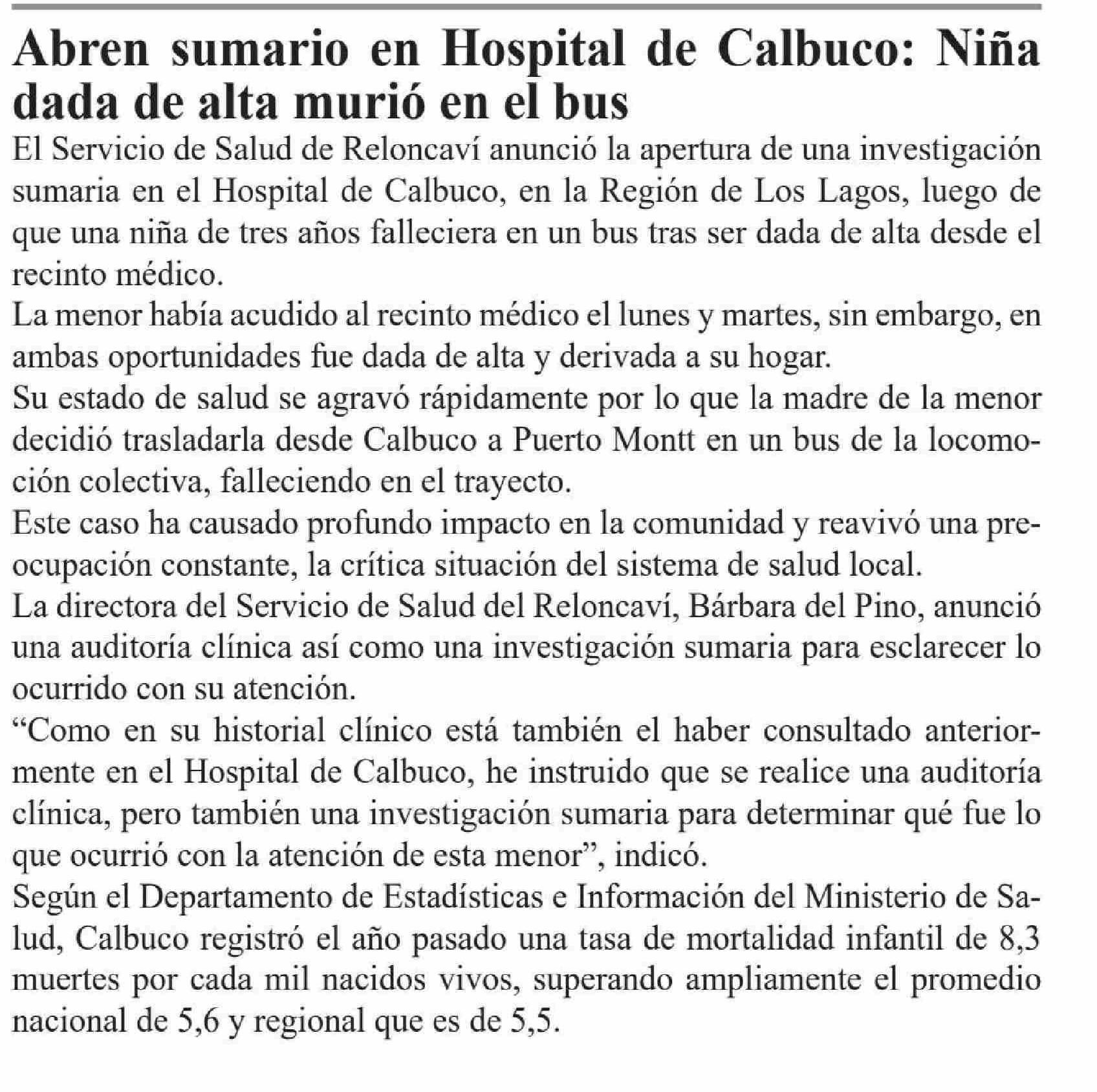| Título: | Abren sumario en Hospital de Calbuco: Niña dada de alta murió en el bus |
