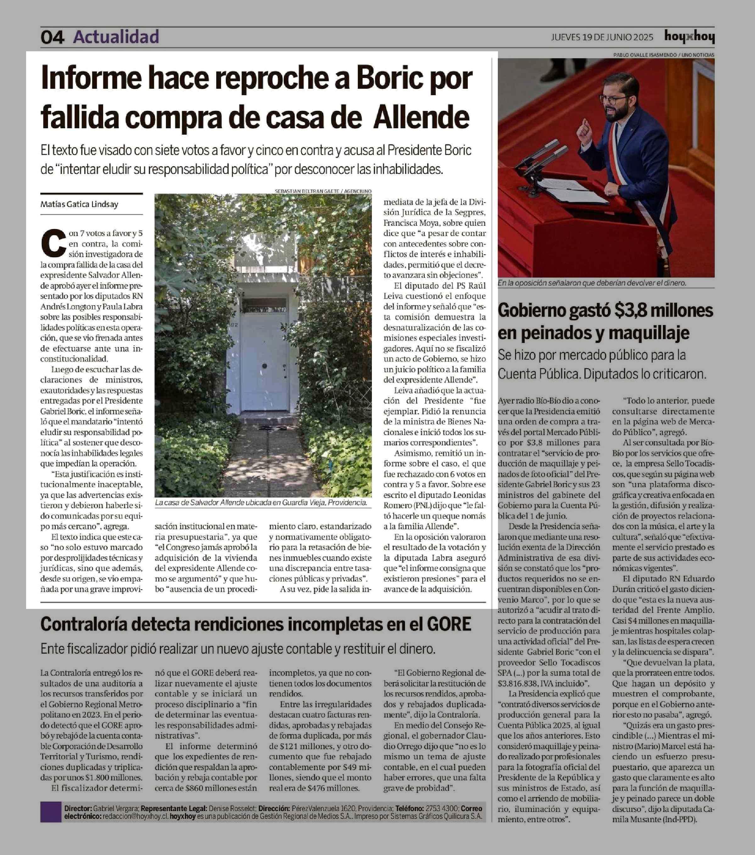 Informe hace reproche a Boric por fallida compra de casa de Allende 19-06-2025 Hoy x Hoy Antofagasta |