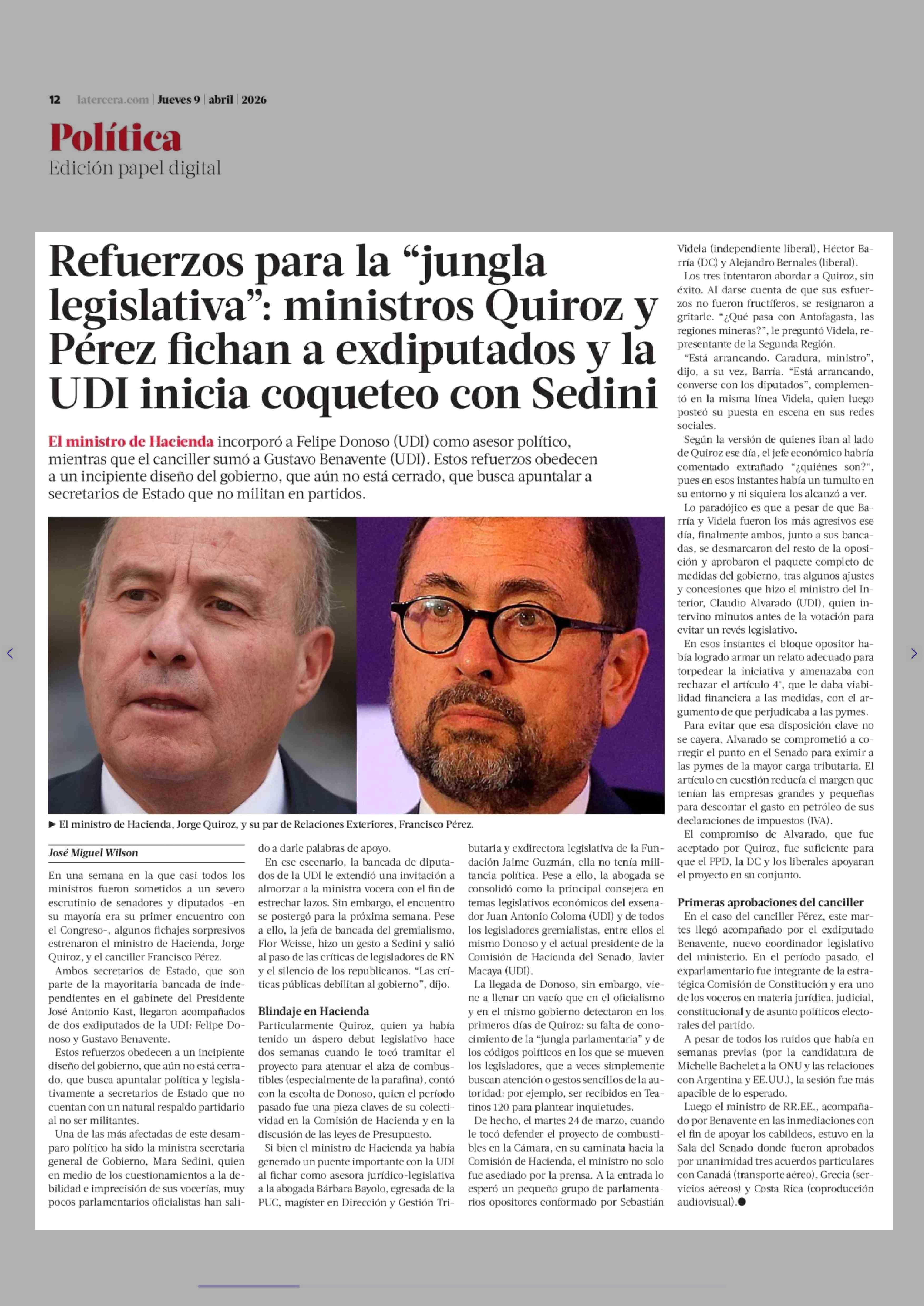 Título: Refuerzos para la "jungla legislativa": ministros Quiroz y Pérez fichan a exdiputados y la UDI inicia coqueteo con Sedini