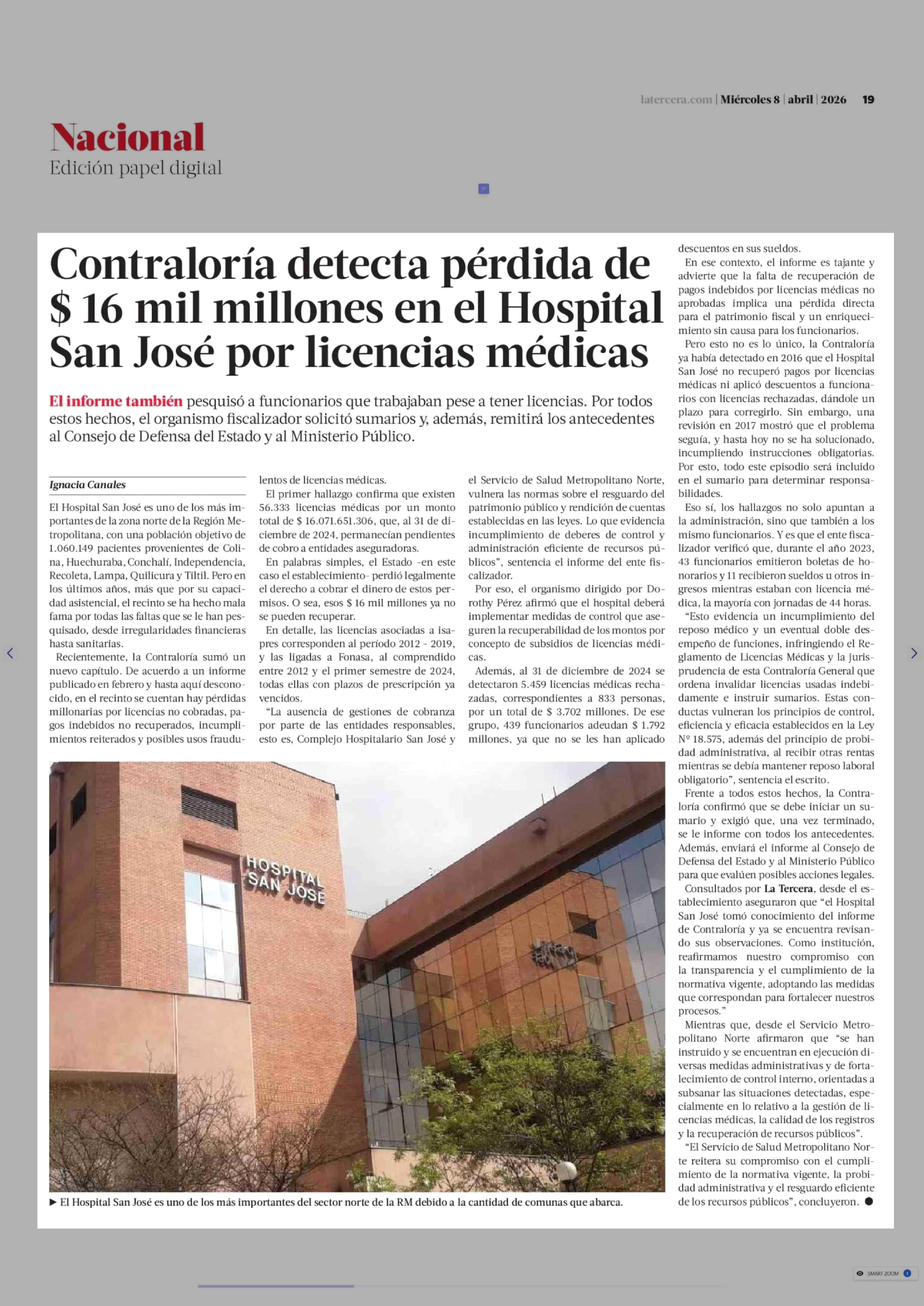 Contraloría detecta pérdida de $ 16 mil millones en el Hospital San José por licencias médicas 08-04-2026 La Tercera |