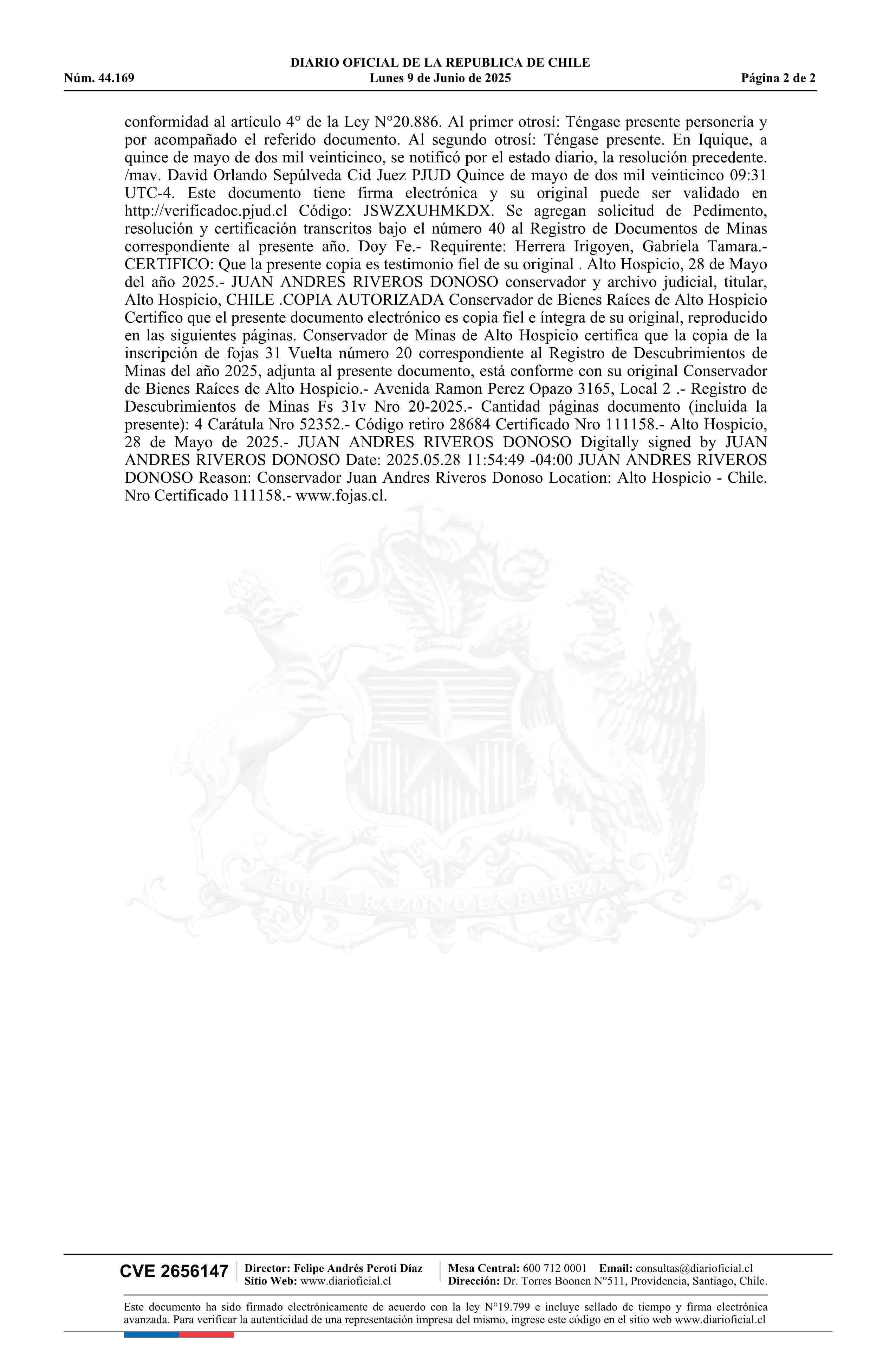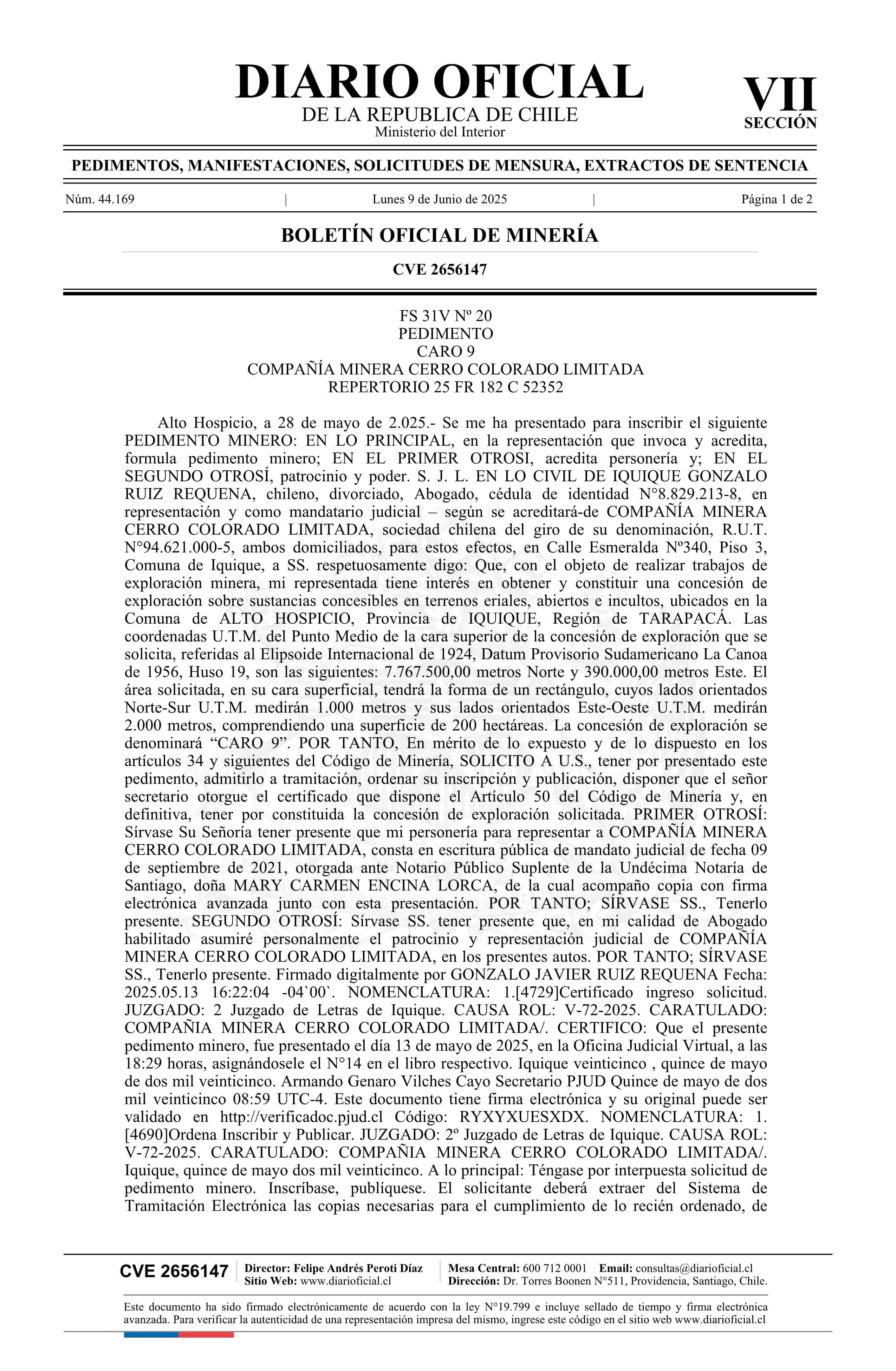 CARO 9 / Compañía Minera Cerro Colorado Limitada 09-06-2025 DIARIO OFICIAL CHILE - BOLETÍN OFICIAL DE MINERÍA |