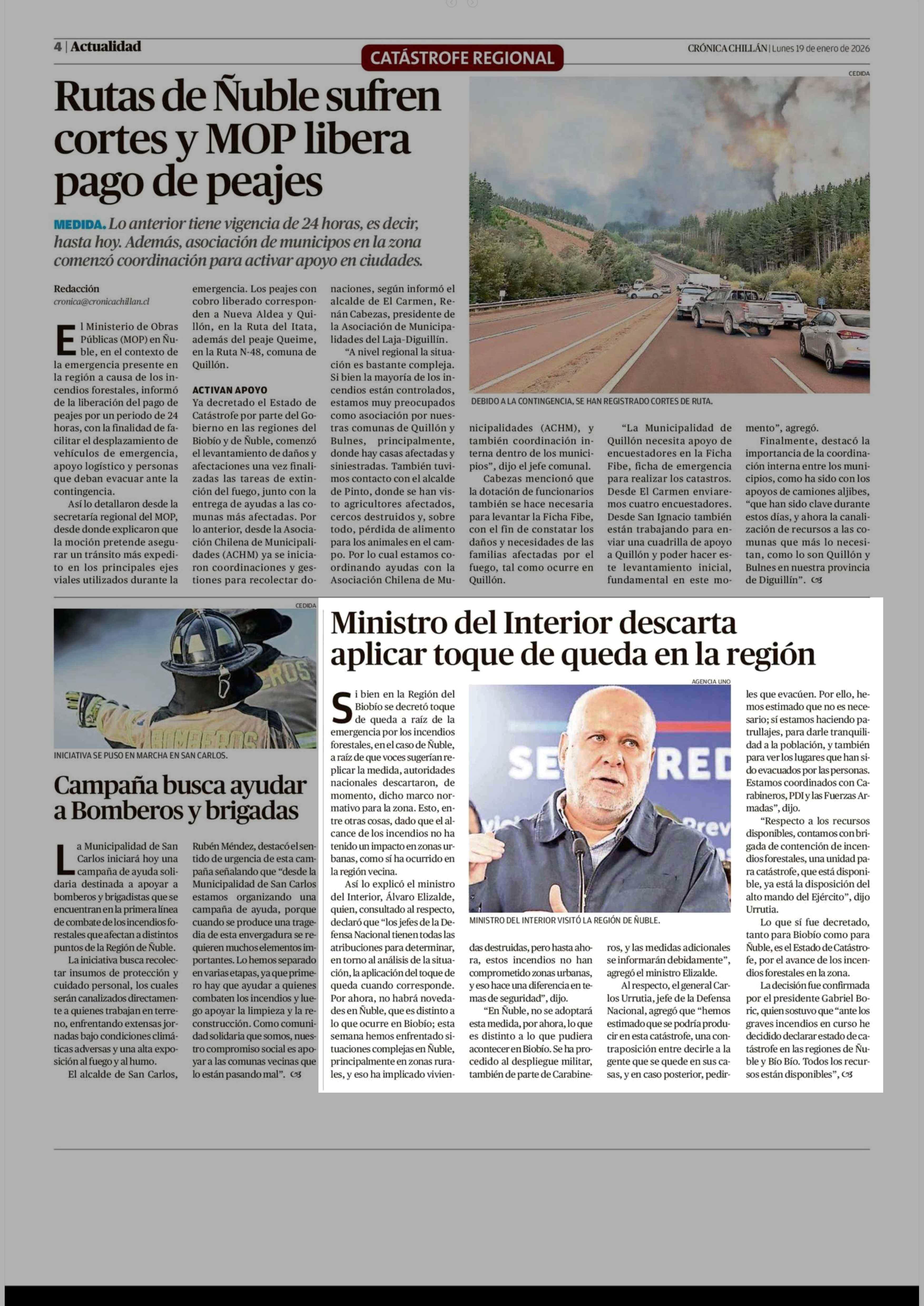 Ministro del Interior descarta aplicar toque de queda en la región 19-01-2026 Crónica de Chillán |