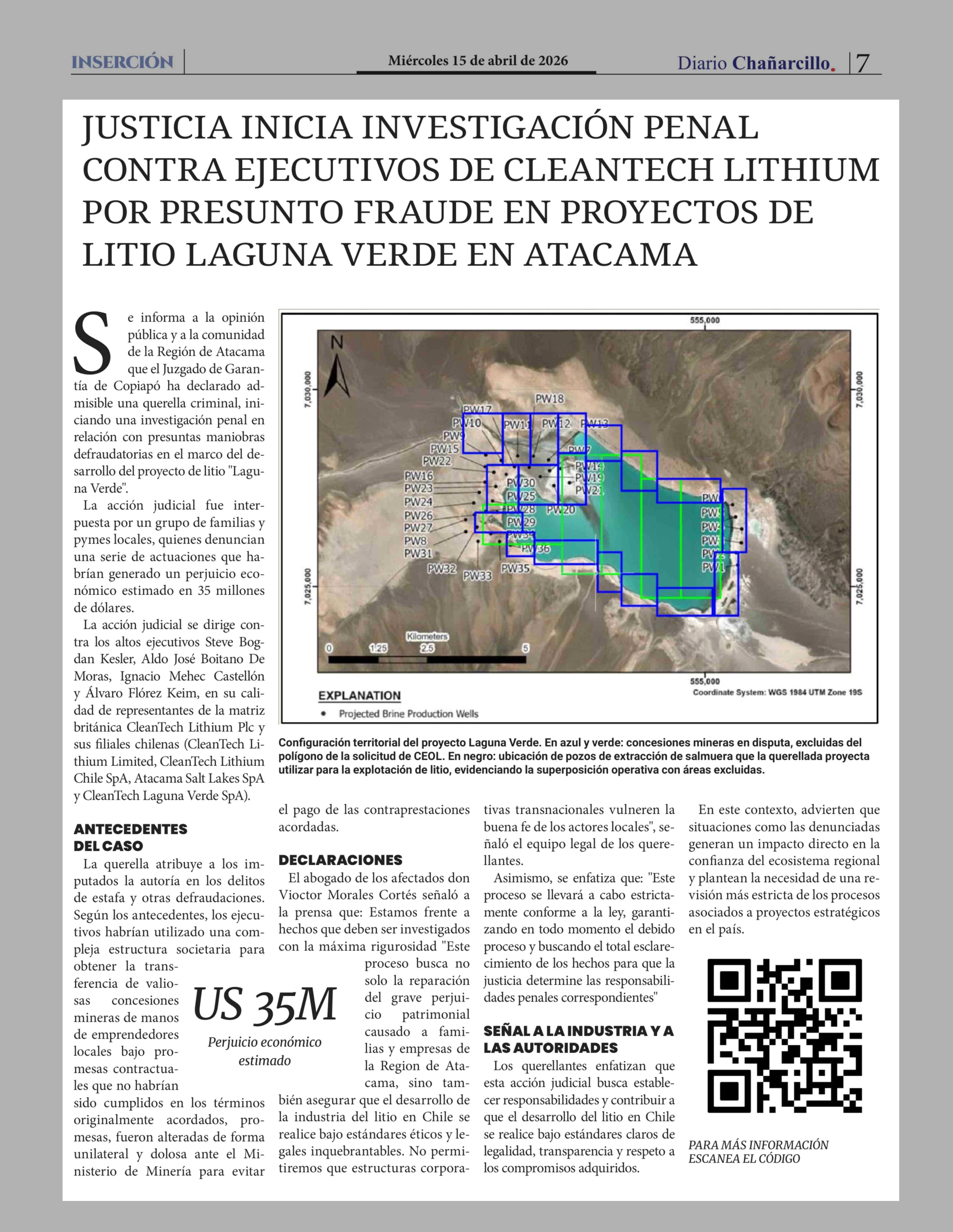JUSTICIA INICIA INVESTIGACIÓN PENAL CONTRA EJECUTIVOS DE CLEANTECH LITHIUM POR PRESUNTO FRAUDE EN PROYECTOS DE LITIO LAGUNA VERDE EN ATACAMA 15-04-2026 Diario Chañarcillo |