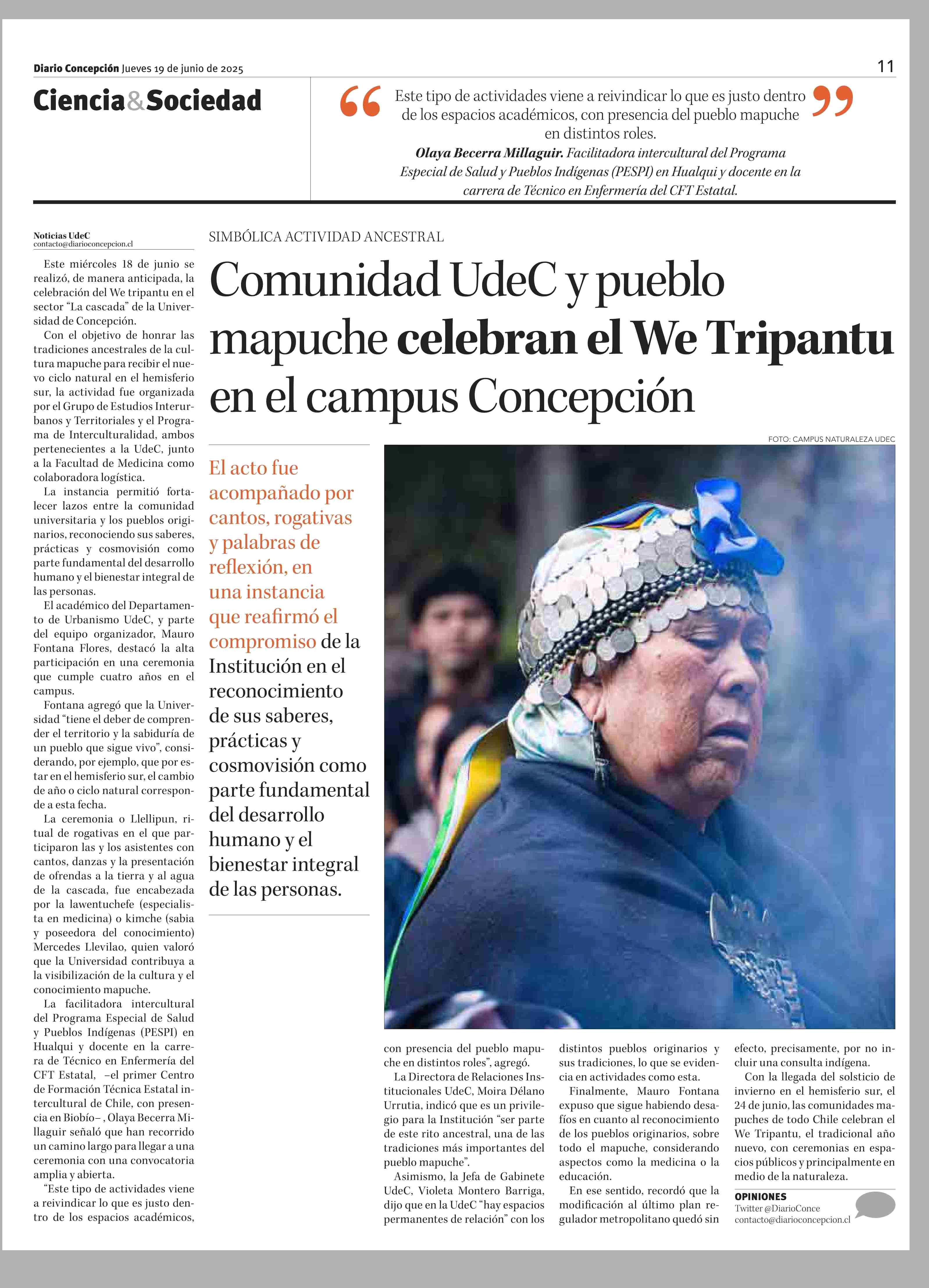 Comunidad UdeC y pueblo mapuche celebran el We Tripantu en el campus Concepción 19-06-2025 Diario Concepción |