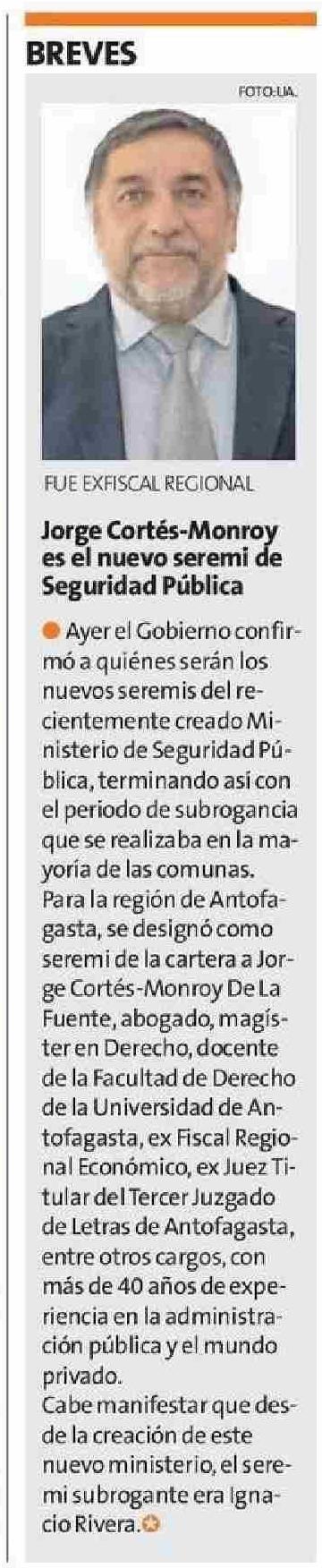 Jorge Cortés-Monro es el nuevo seremi Seguridad Pública 31-05-2025 La Estrella de Antofagasta |
