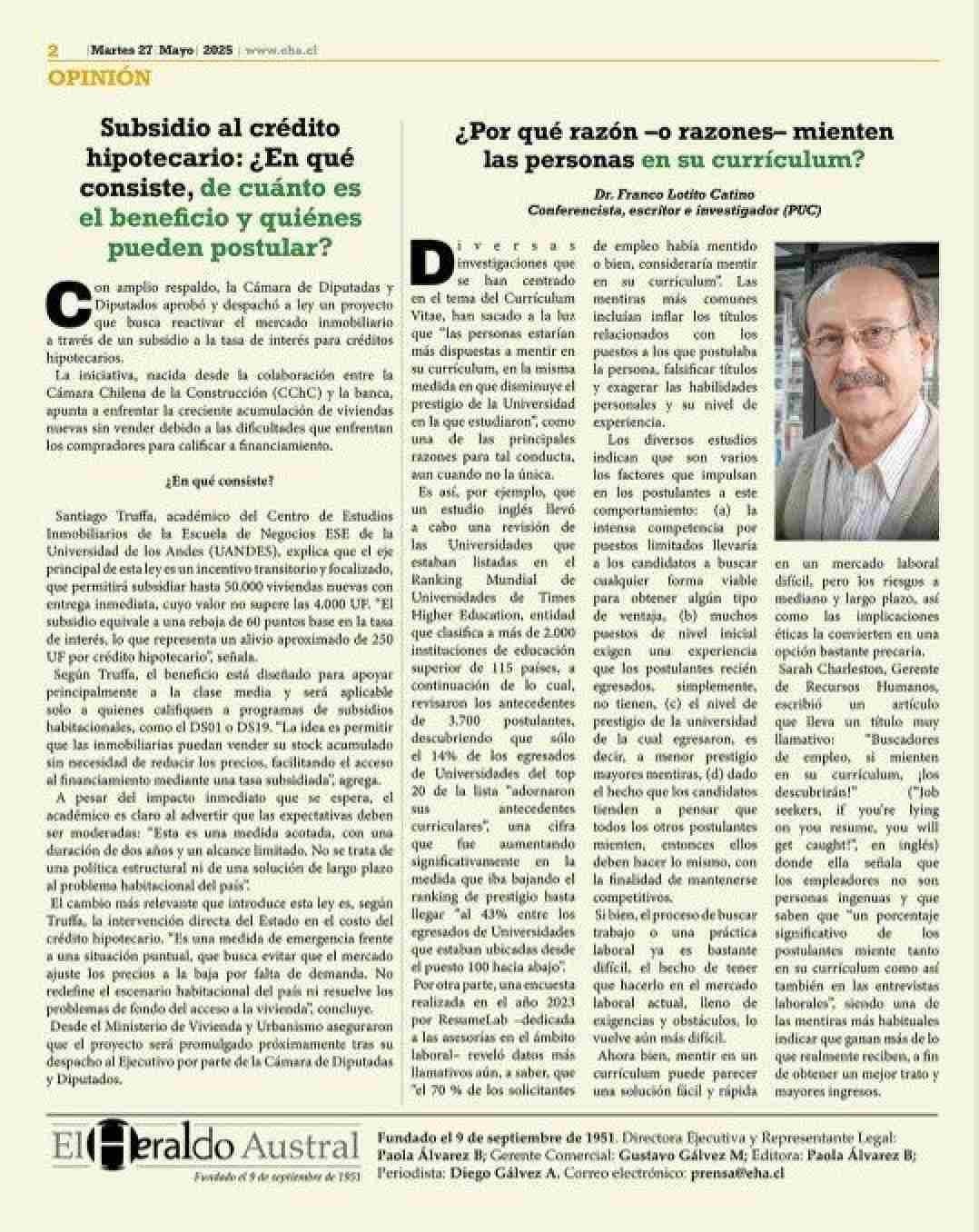 COLUMNAS DE OPINIÓN: ¿Por qué razón —o razonesmienten las personas en su curriculum? 27-05-2025 El Heraldo Austral |