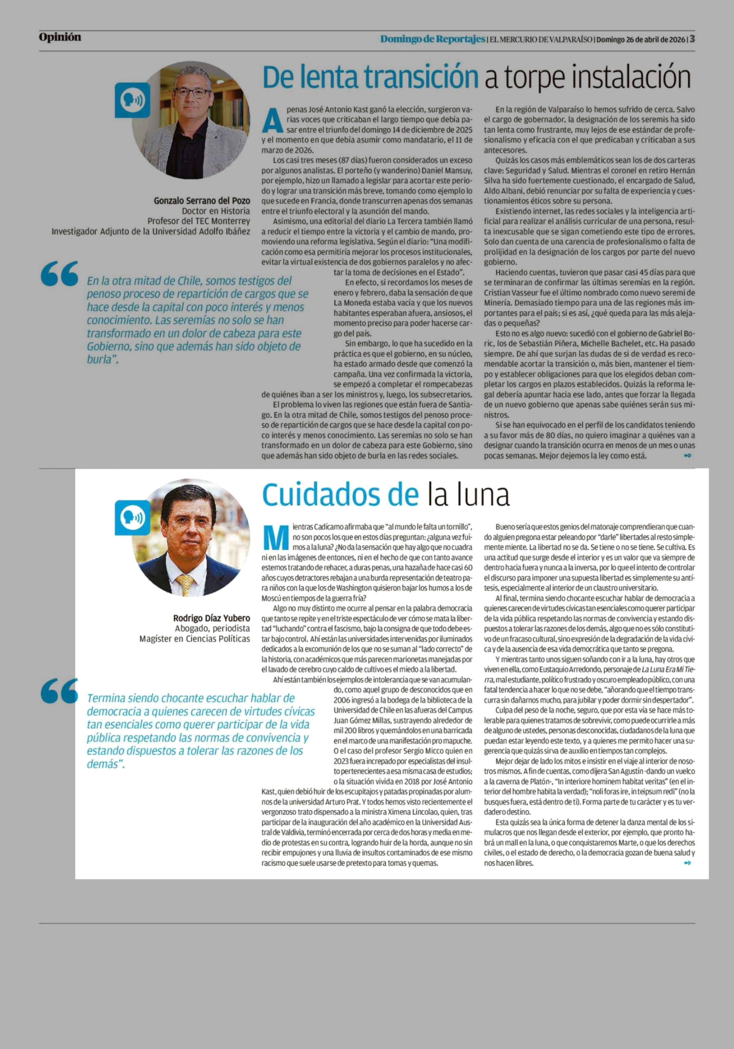 Columnas de Opinión: Cuidados de la luna 26-04-2026 El Mercurio de Valparaíso |