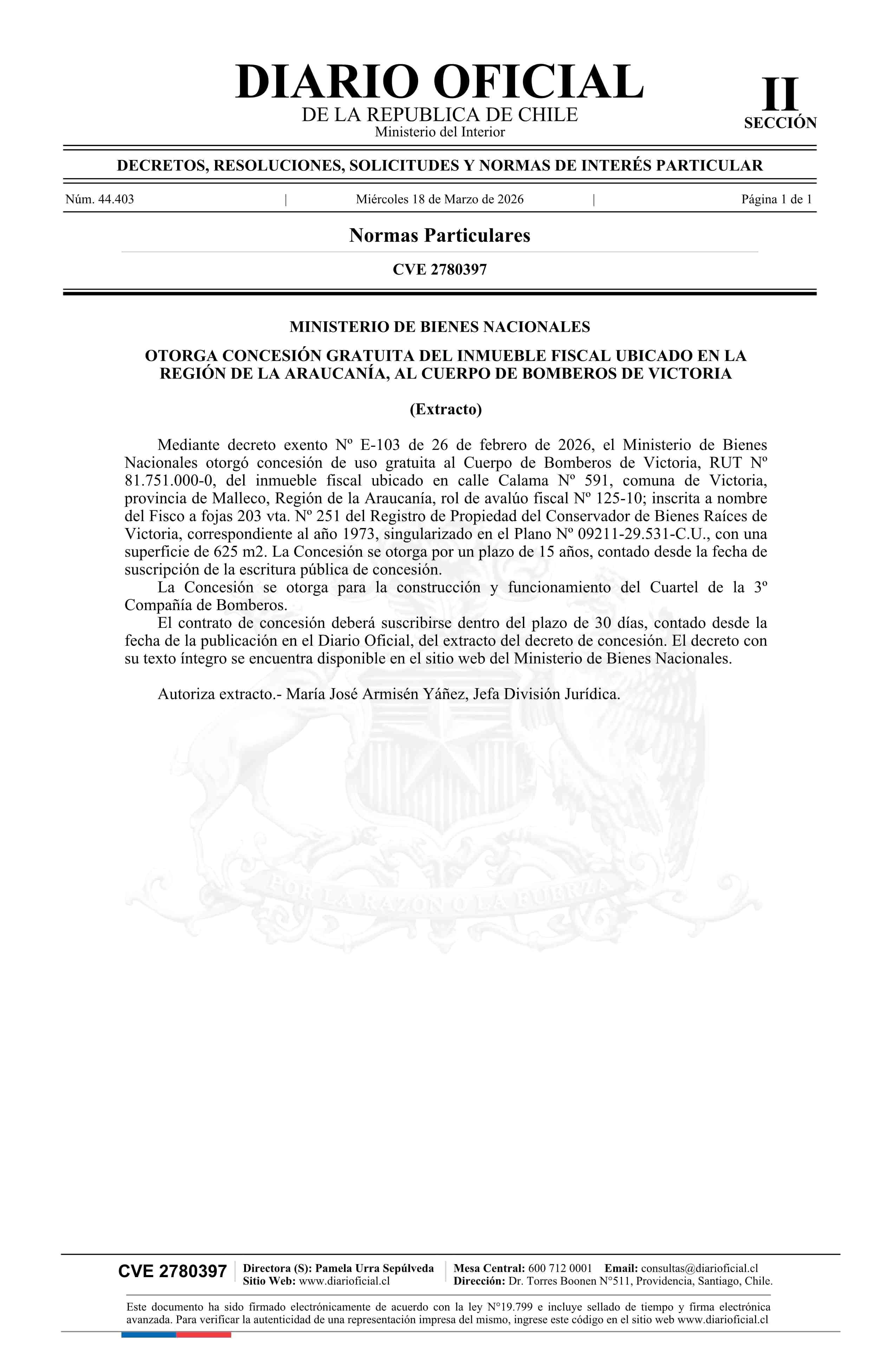Título: Extracto de decreto exento número E-103, de 2026.- Otorga concesión gratuita de inmueble fiscal ubicado en la Región de la Araucanía, al Cuerpo de Bomberos de Victoria