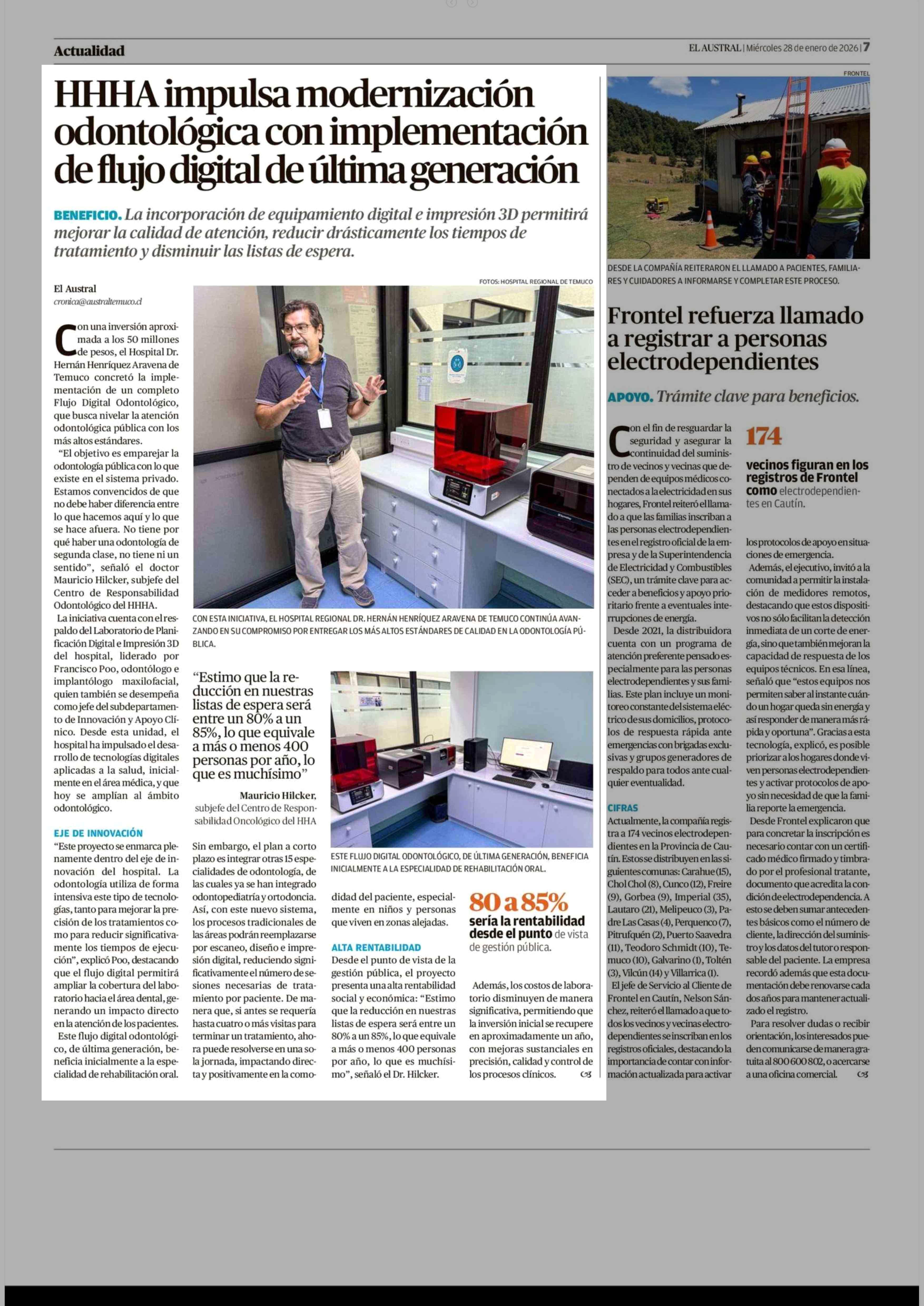 HHHA impulsa modernización odontológica con implementación de flujo digital de última generación 28-01-2026 El Austral de la Araucanía |