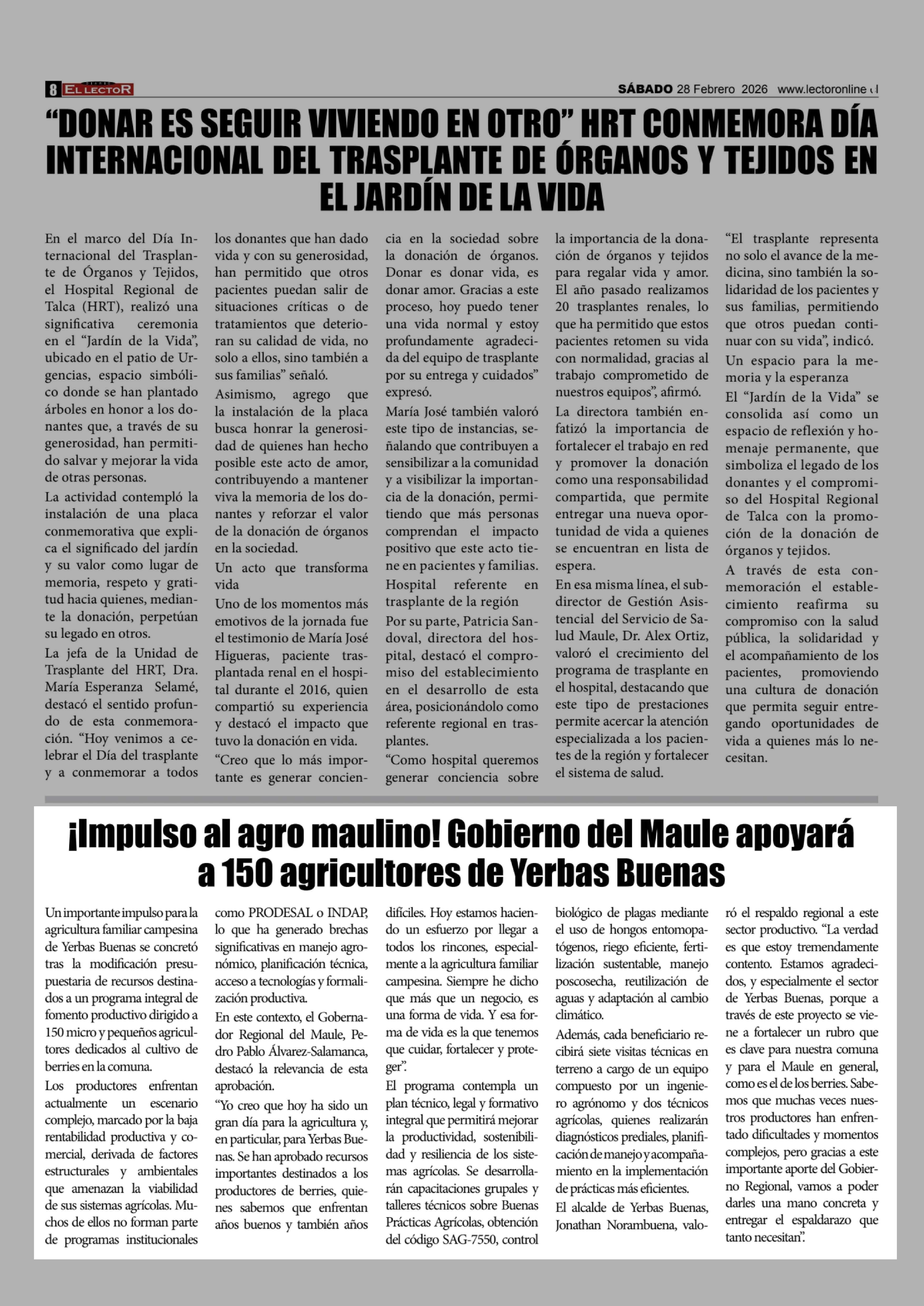 Ilmpulso al agro maulino! Gobierno del Maule apoyará a 150 agricultores de Yerbas Buenas 28-02-2026 El Lector |