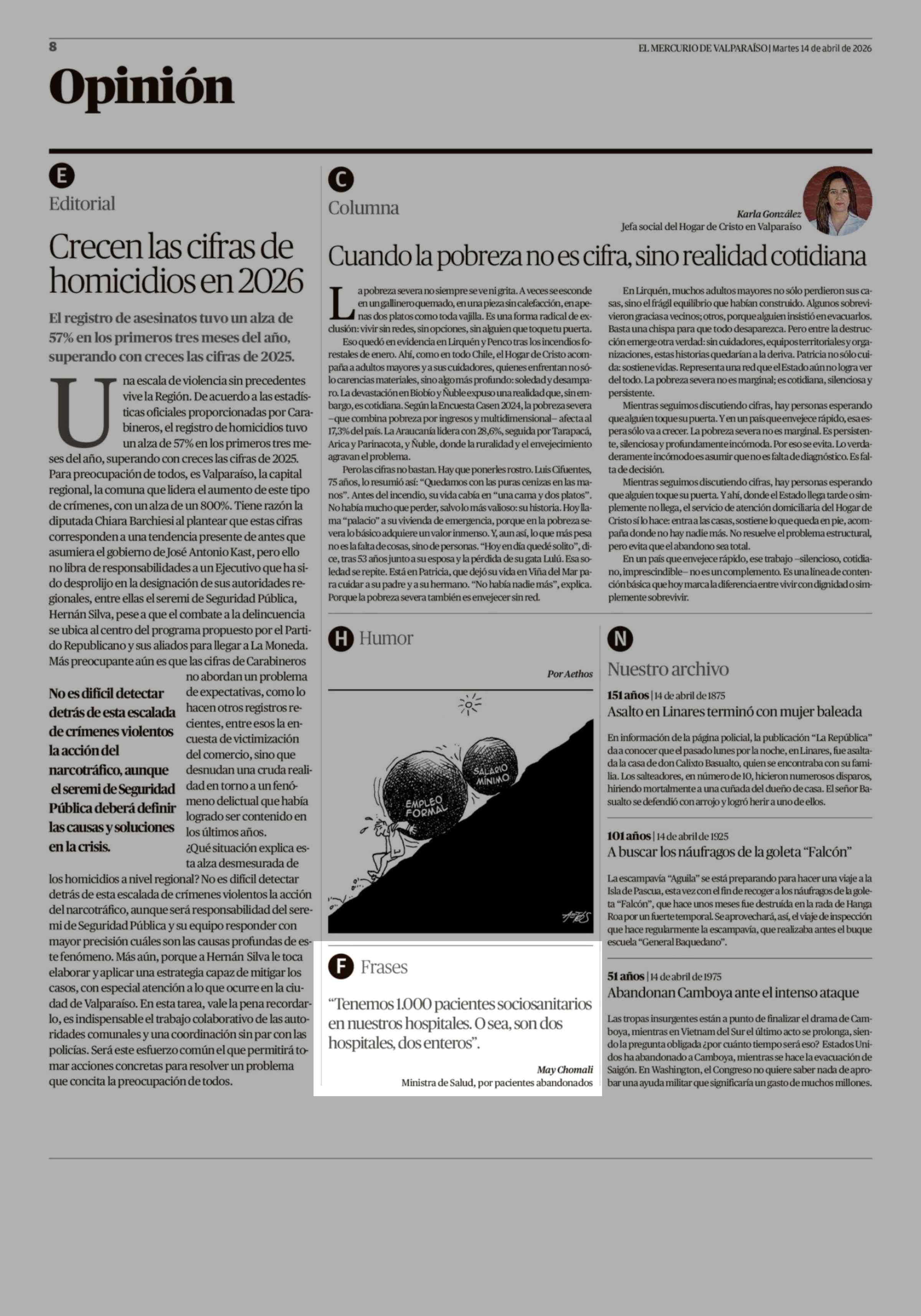 May Chomali Ministra de Salud, por pacientes abandonados 14-04-2026 El Mercurio de Valparaíso |