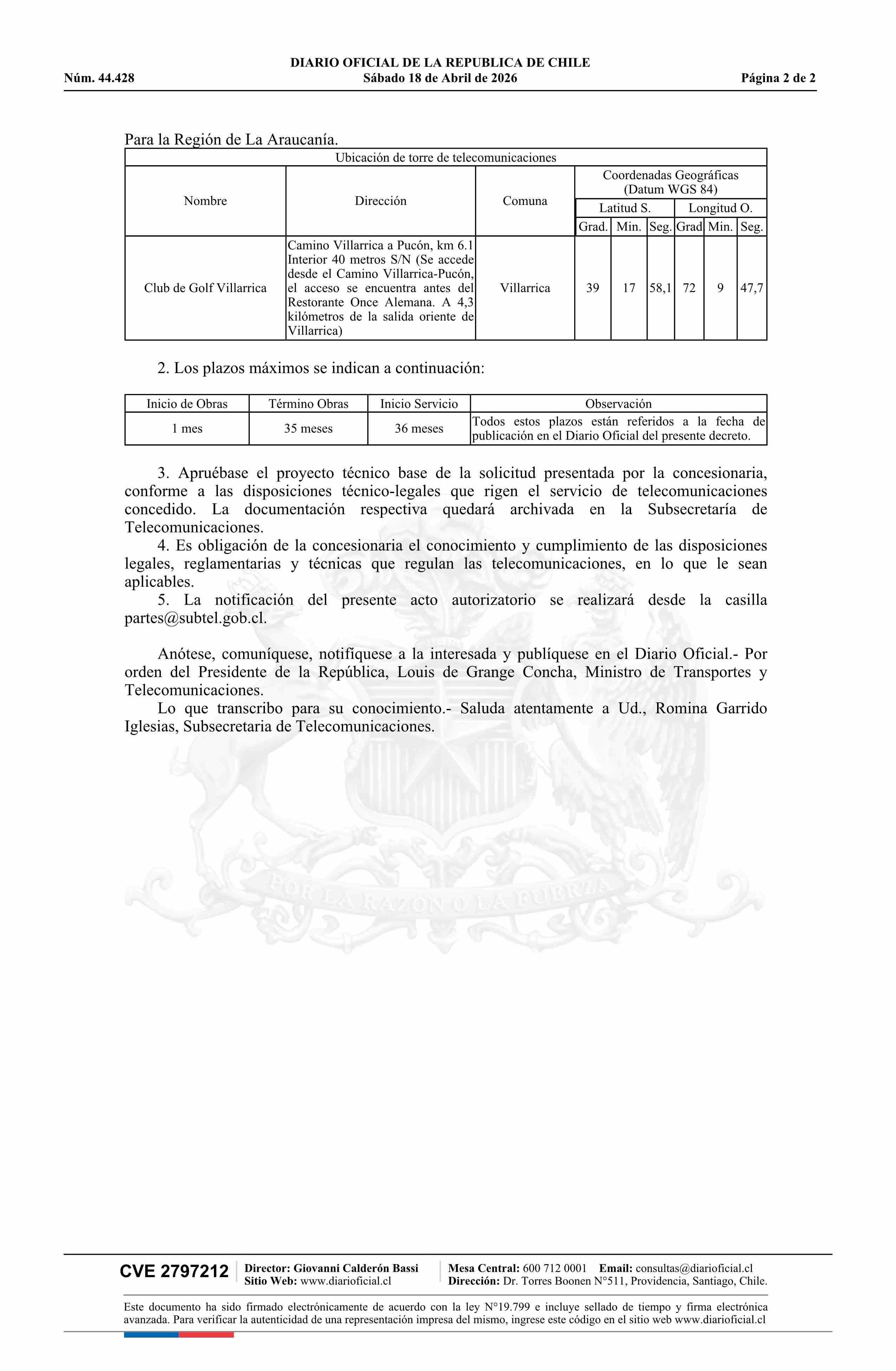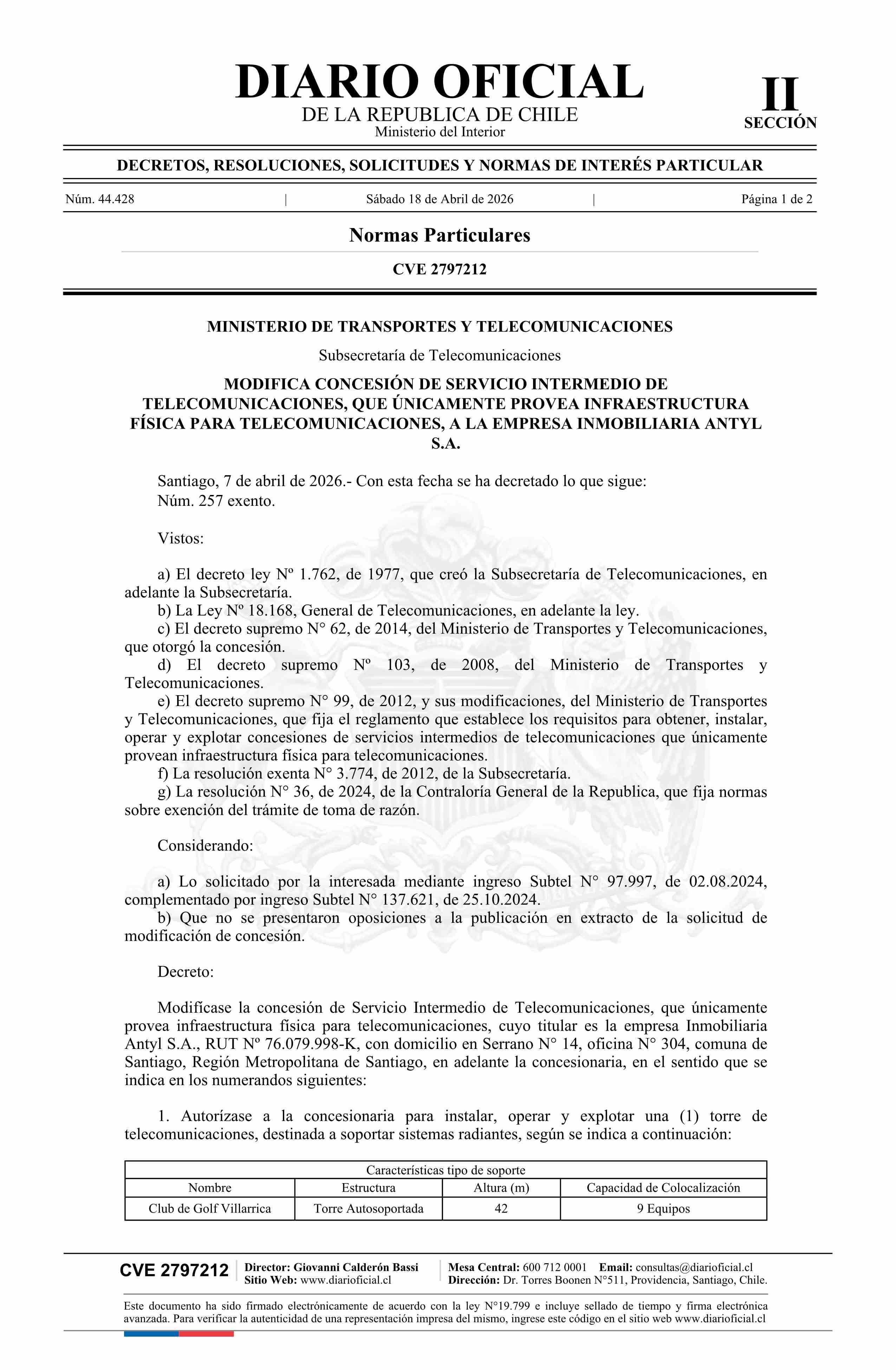Título: Decreto exento número 257, de 2026.- Modifica concesión de servicio intermedio de telecomunicaciones, que únicamente provea infraestructura física para telecomunicaciones, a la empresa Inmobiliaria Antyl S.A.