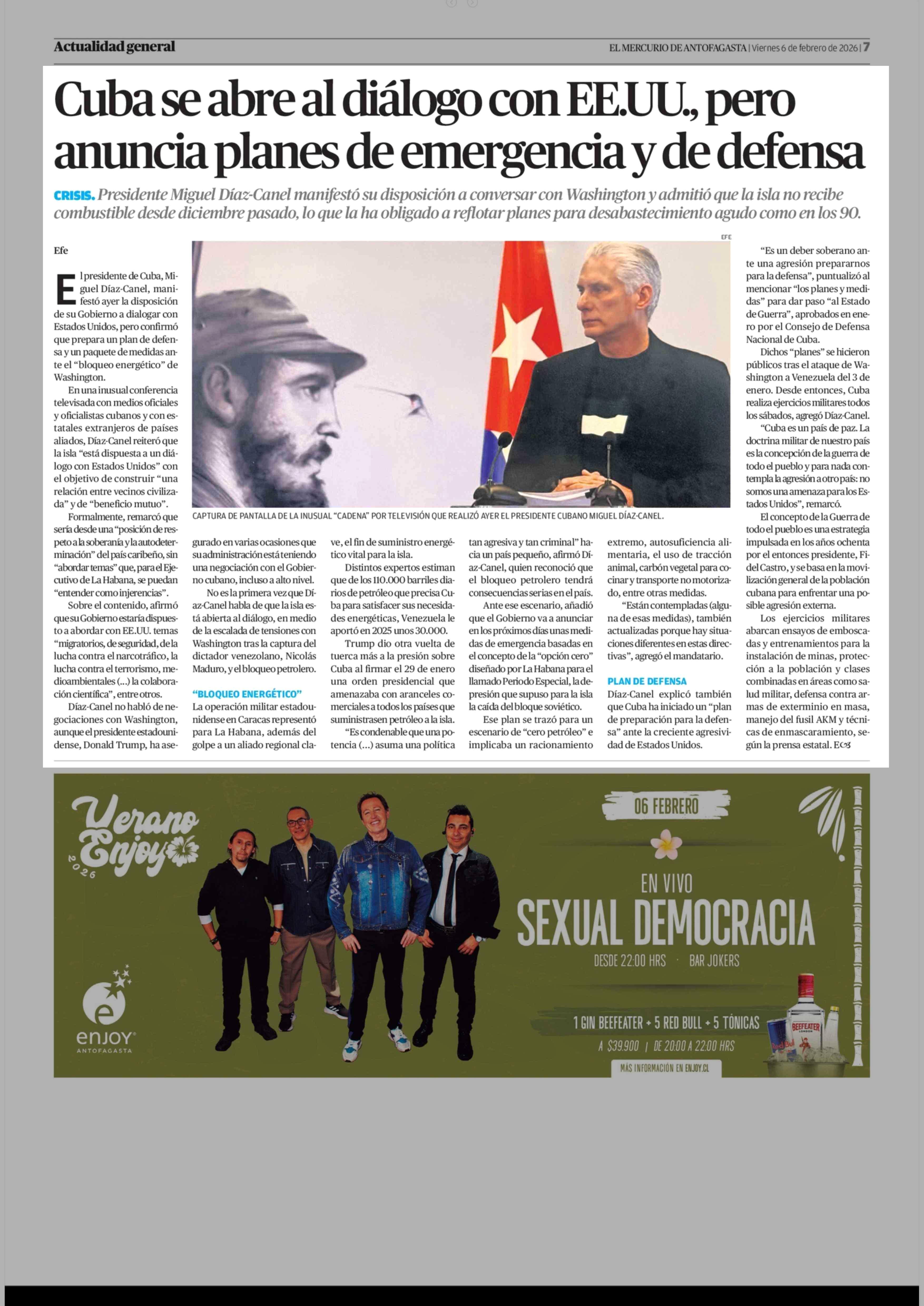 Cuba se abre al diálogo con EE.UU., pero anuncia planes de emergencia y de defensa 06-02-2026 El Mercurio de Antofagasta |