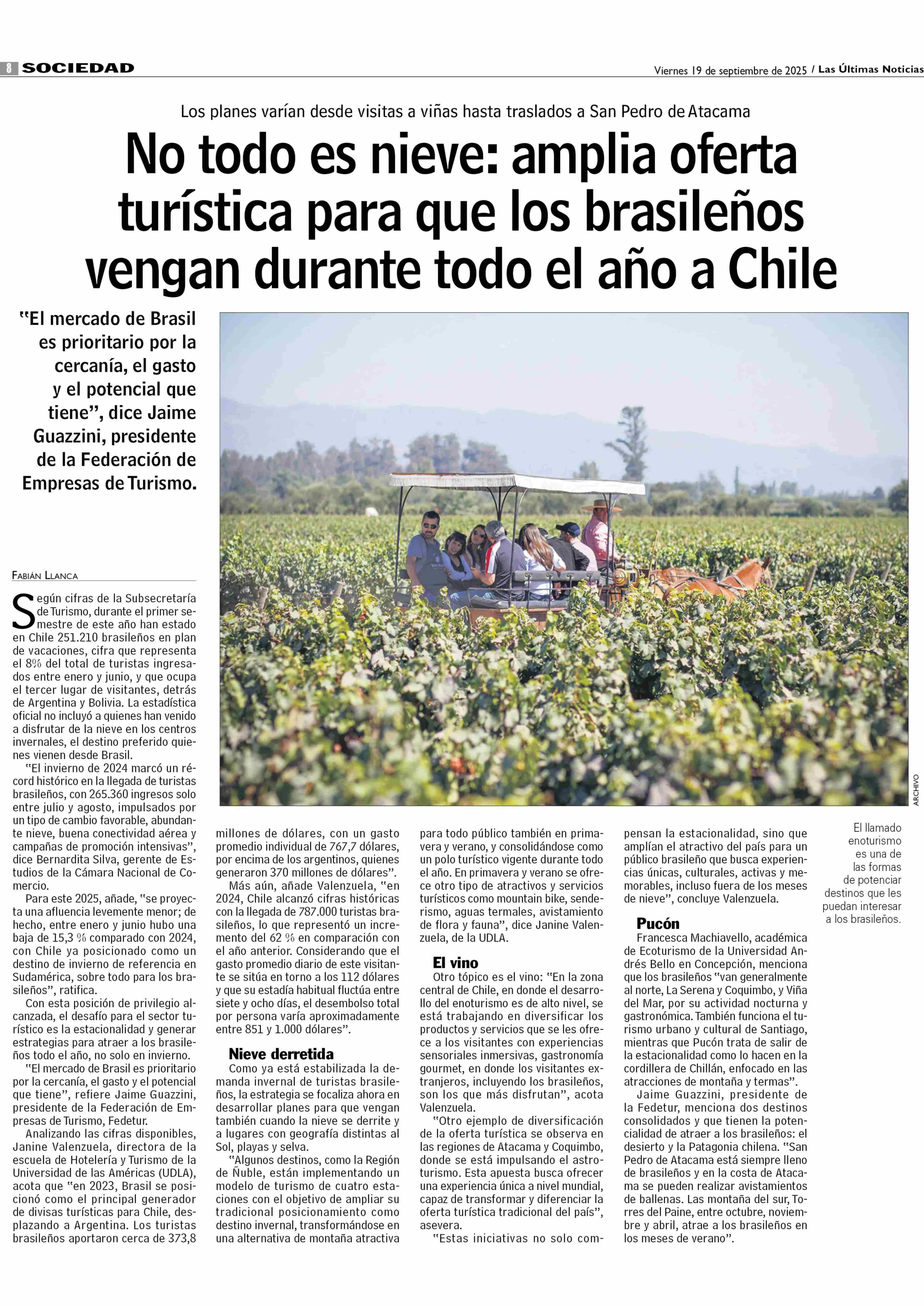 No todo es nieve: amplia oferta turística para que los brasileños vengan durante todo el año a Chile 19-09-2025 Las Últimas Noticias |
