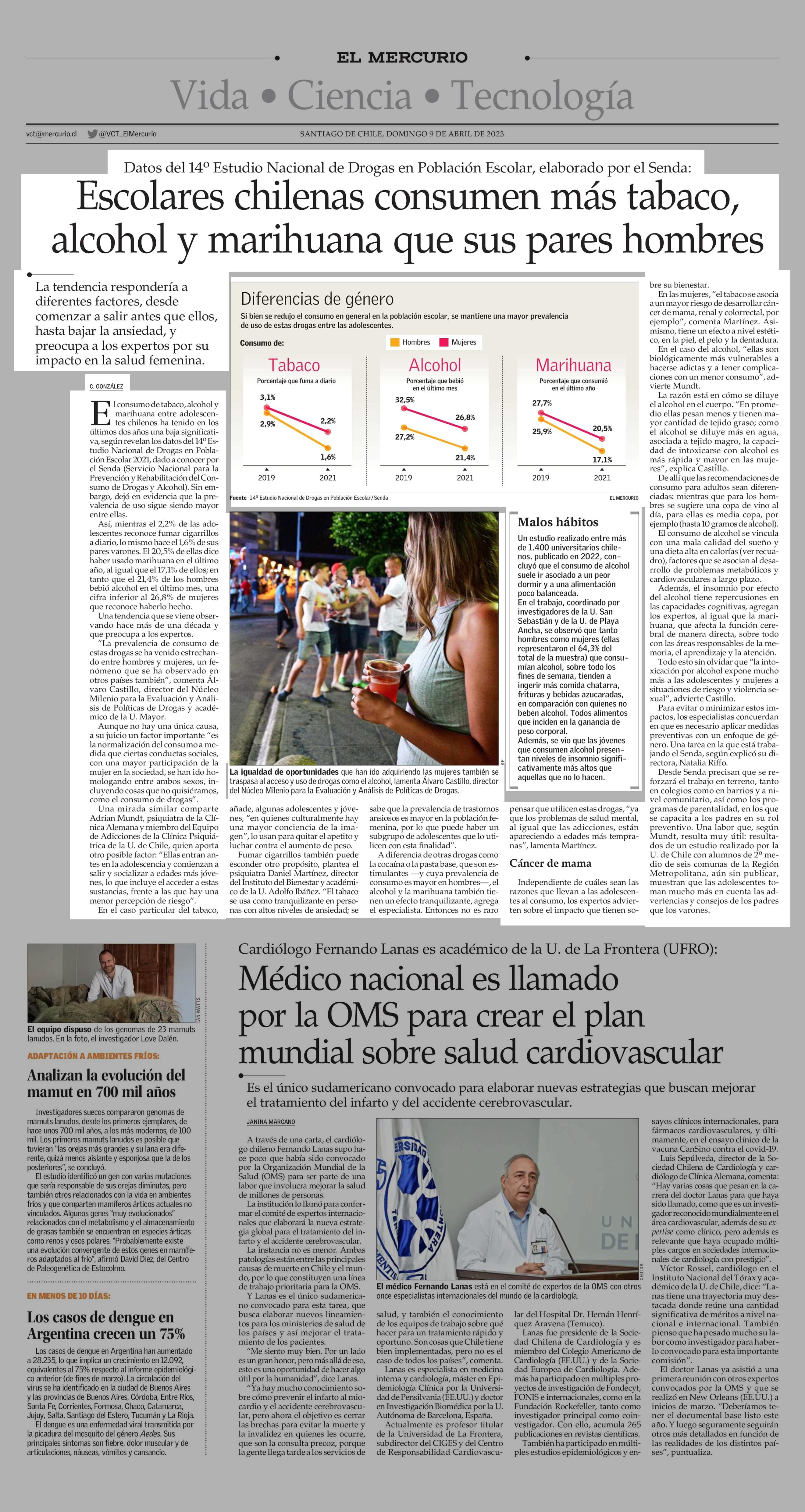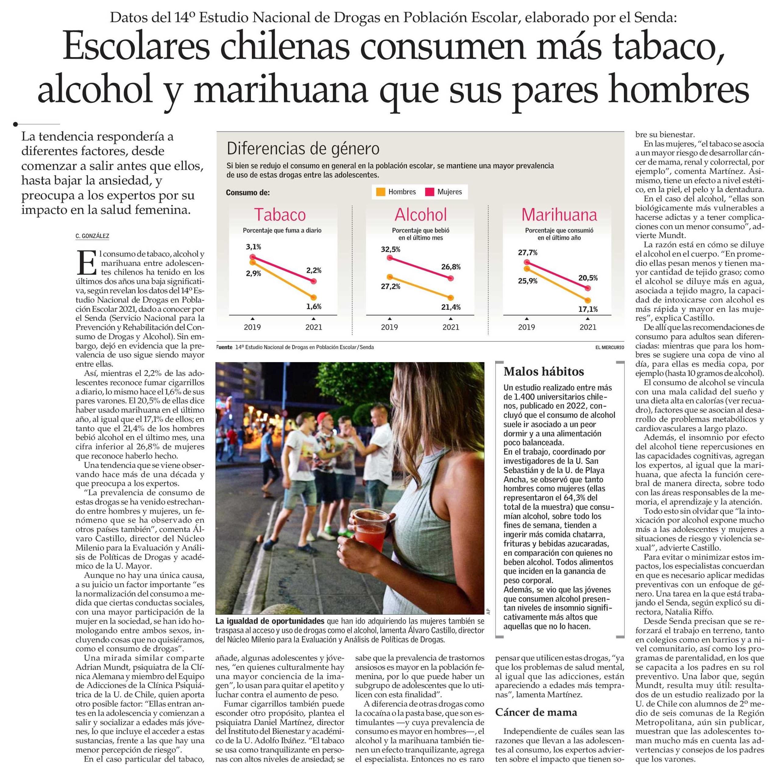 Escolares chilenas consumen más tabaco, alcohol y marihuana que sus pares hombres 09-04-2023 El Mercurio |