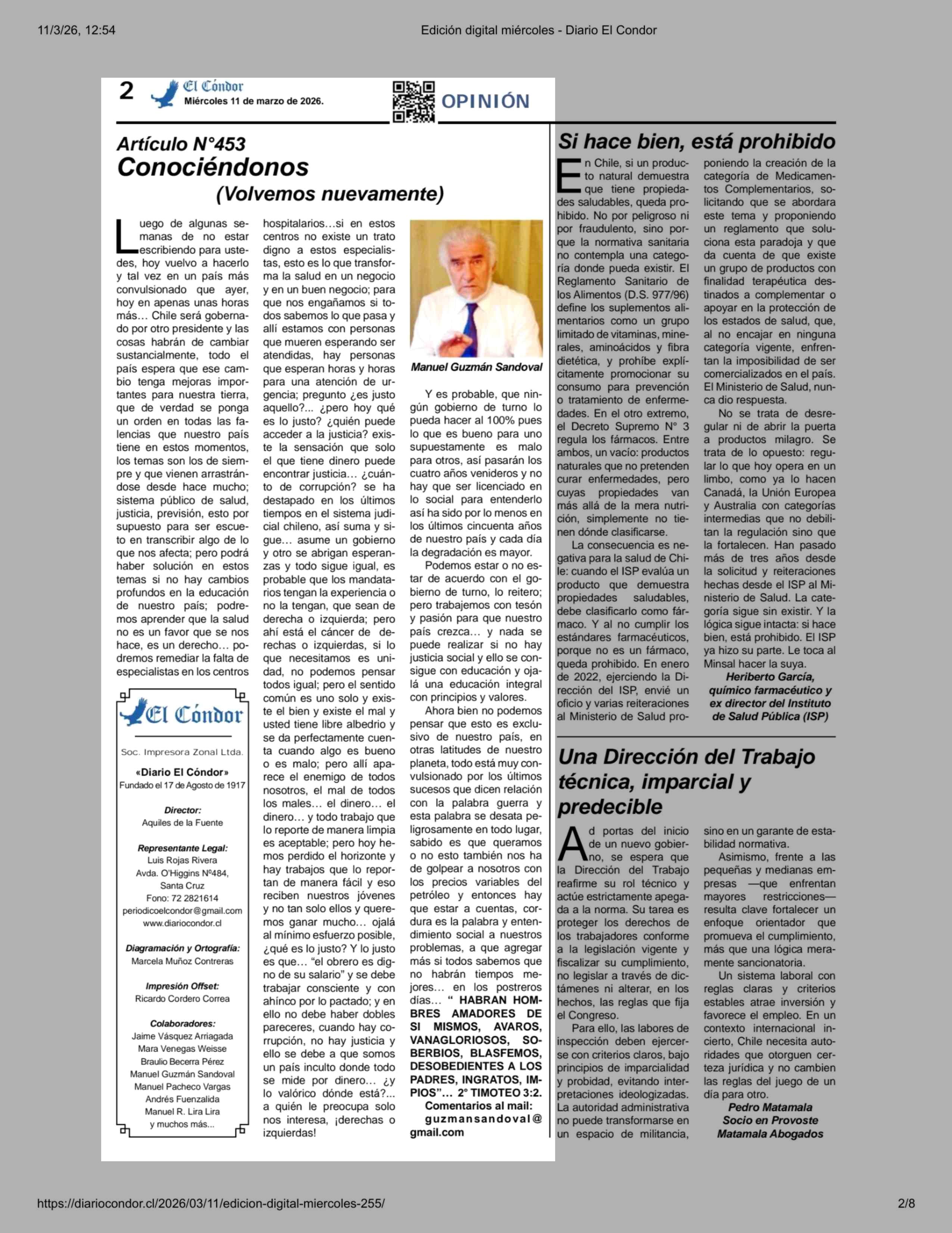 Columnas de Opinión: Artículo Nº453 Conociéndonos (Volvemos nuevamente) 11-03-2026 Diario El Cóndor |