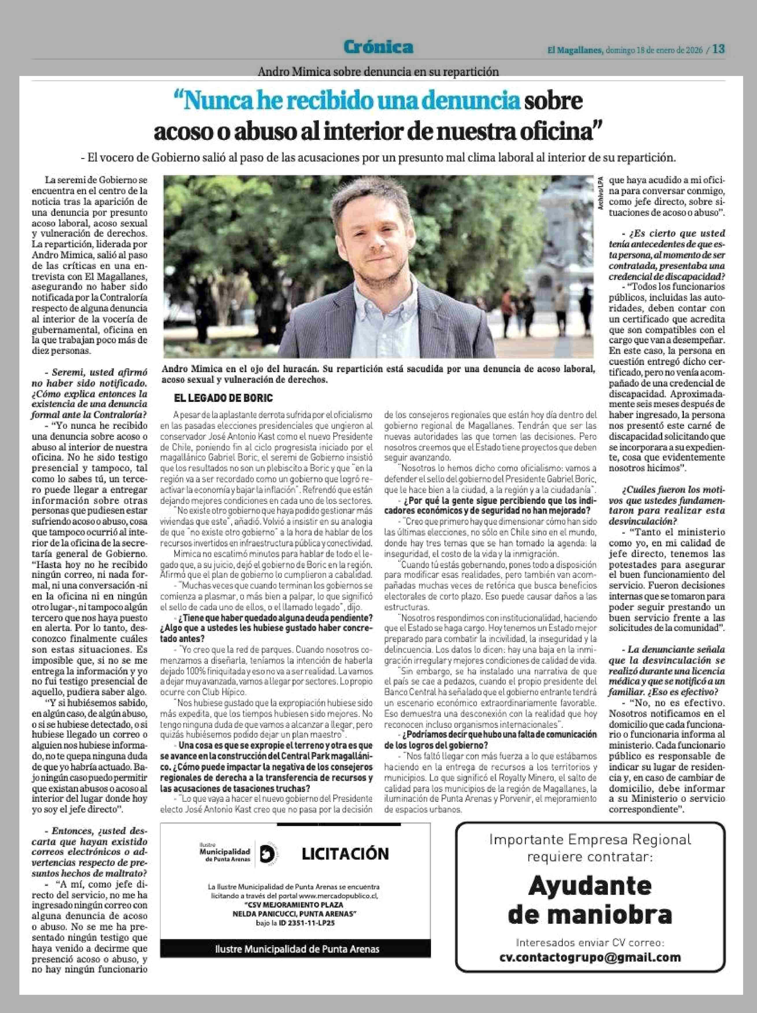 "Nunca he recibido una denuncia sobre acoso o abuso al interior de nuestra oficina" 18-01-2026 El Magallanes |