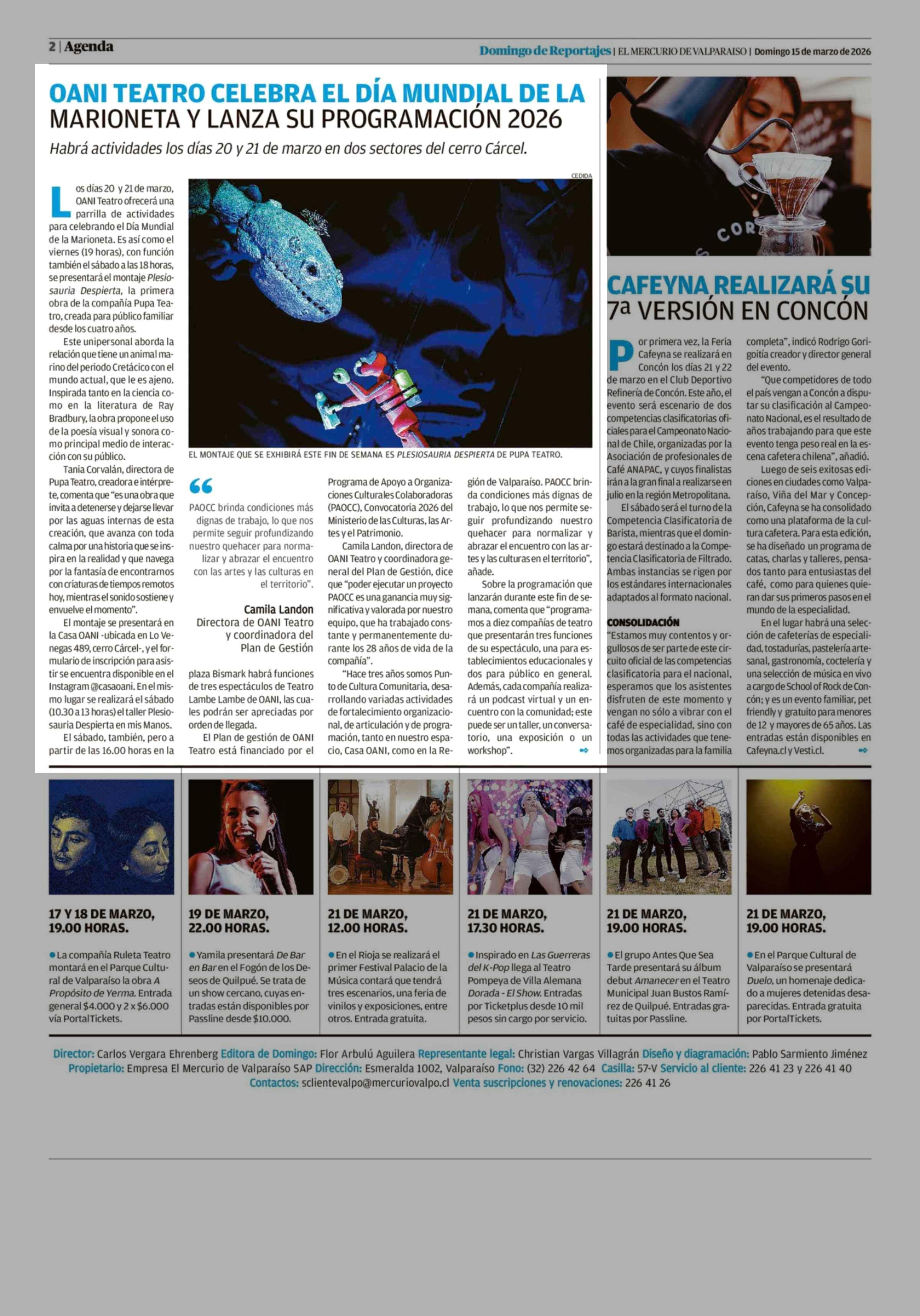 OANI TEATRO CELEBRA EL DÍA MUNDIAL DE LA MARIONETA Y LANZA SU PROGRAMACIÓN 2026 15-03-2026 El Mercurio de Valparaíso |