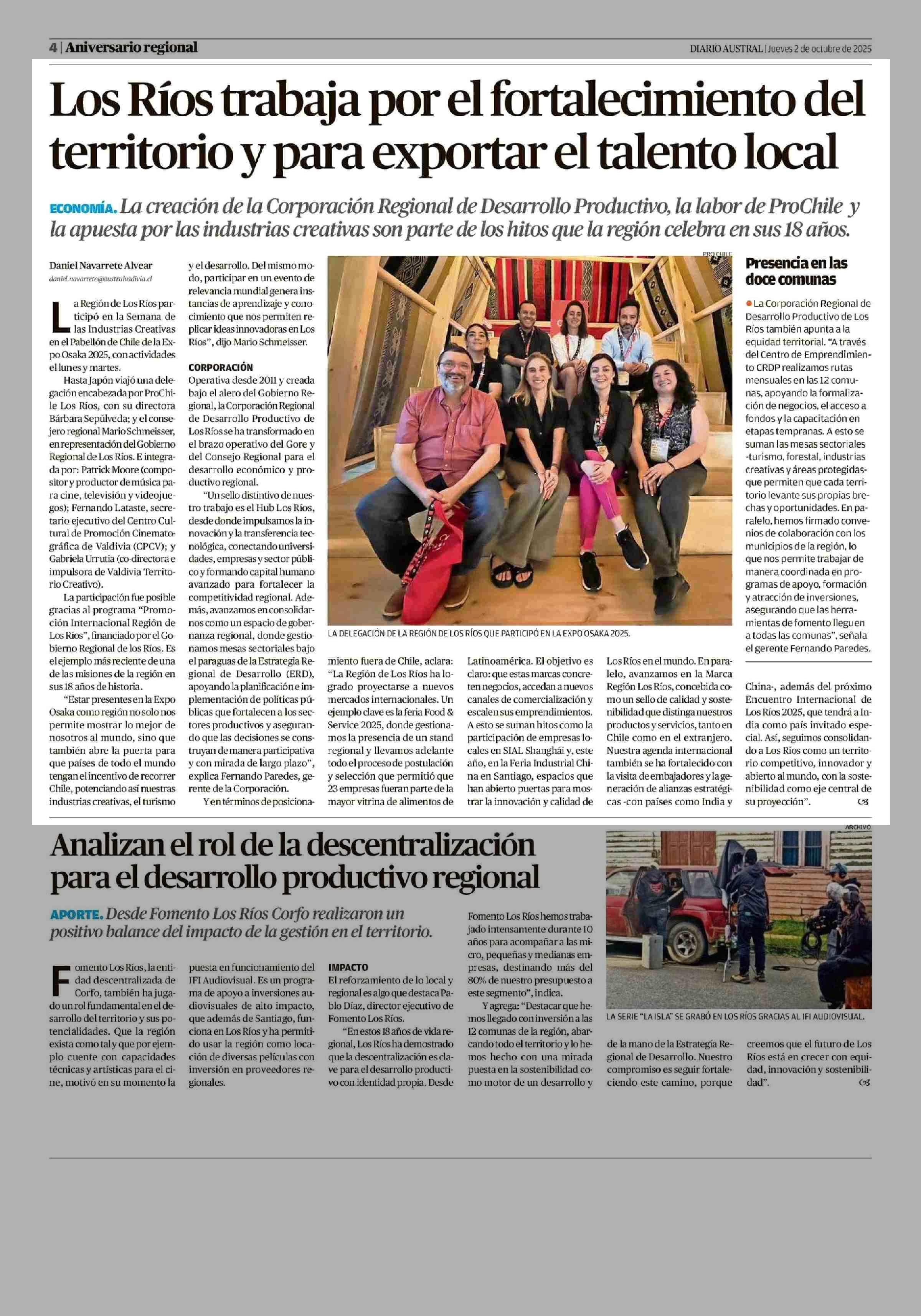 Los Ríos trabaja por el fortalecimiento del territorio y para exportar el talento local 02-10-2025 Diario Austral Región de Los Ríos |