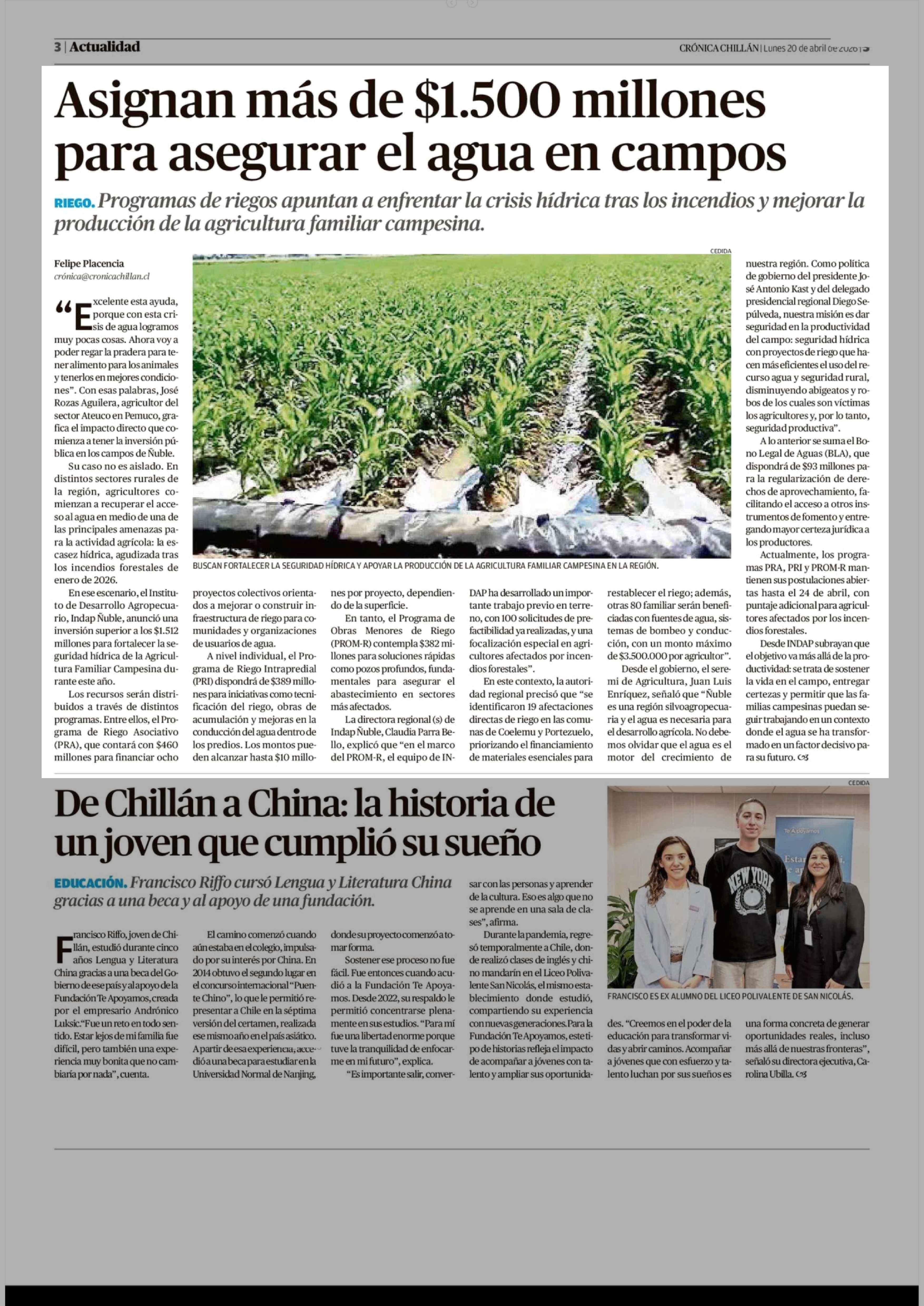 Fecha: 20-04-2026 Sector: Noticia general Región: Región del Ñuble