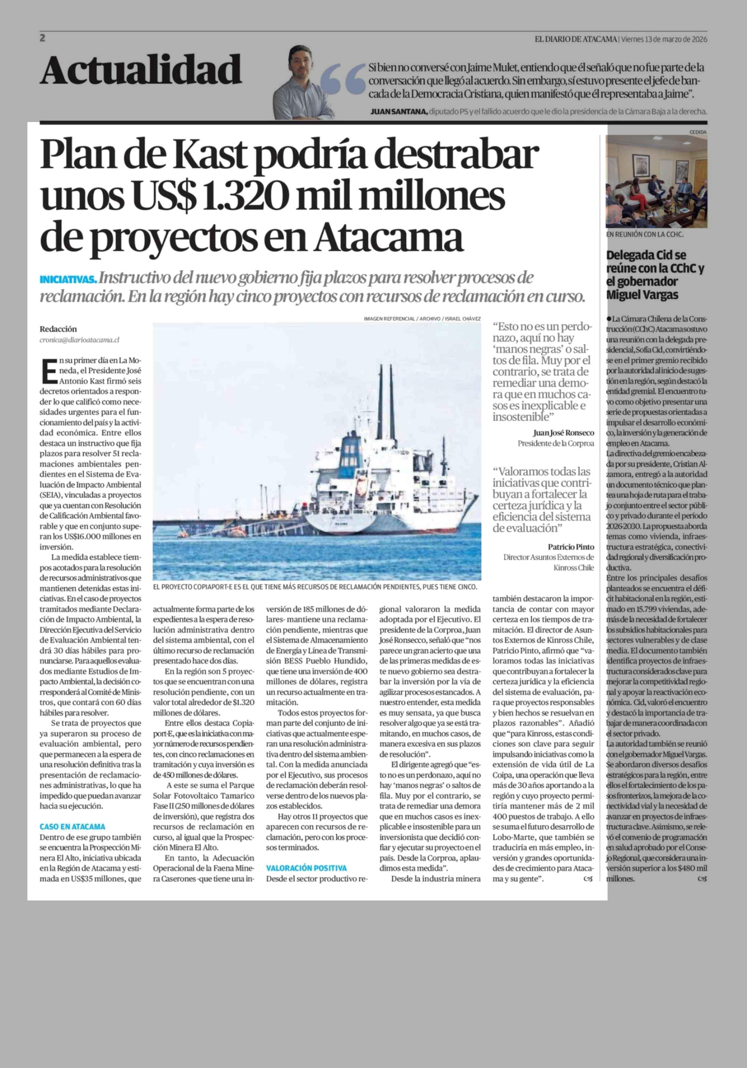 Plan de Kast podría destrabar unos US$ 1.320 mil millones de proyectos en Atacama 13-03-2026 El Diario de Atacama |
