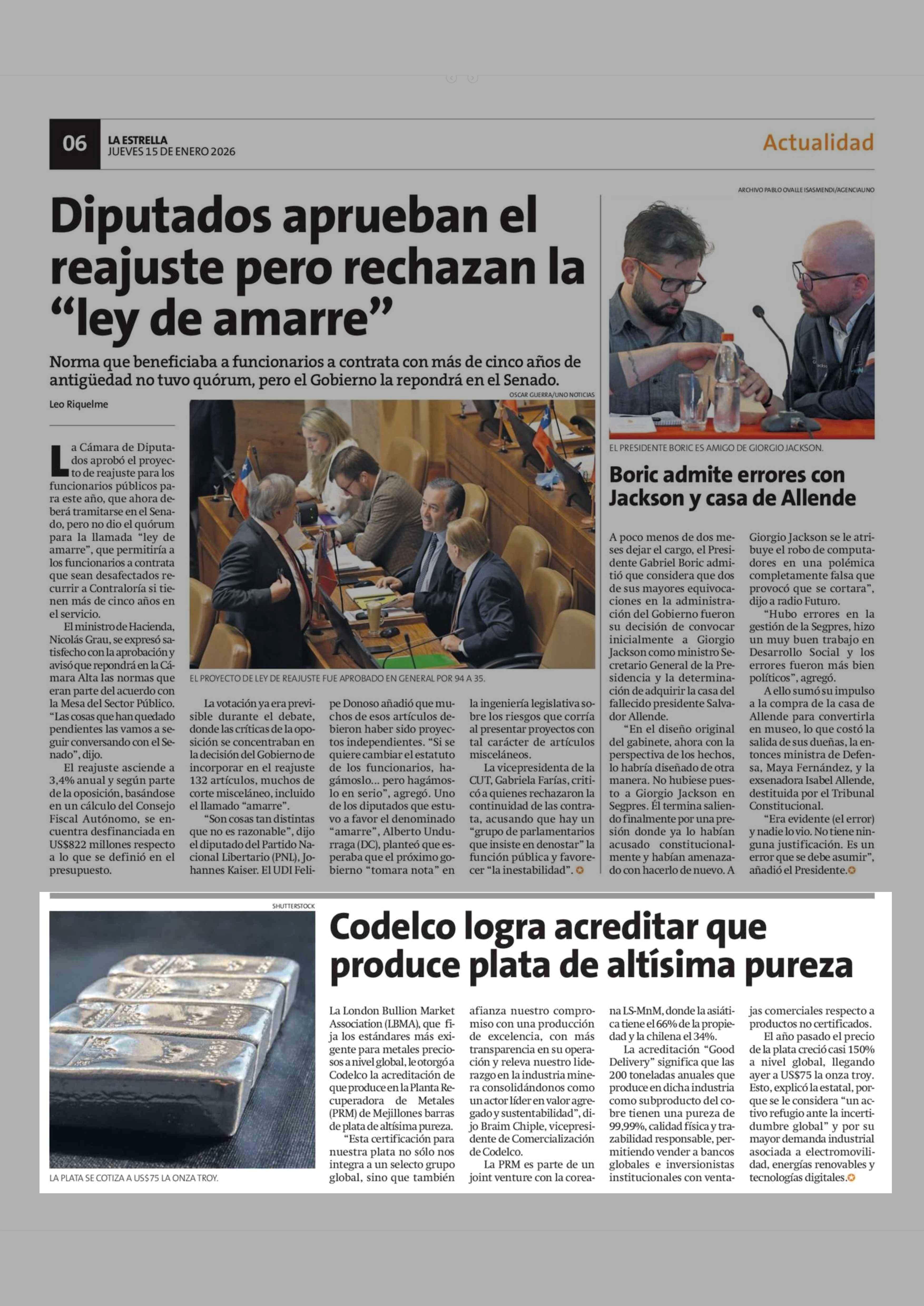 Codelco logra acreditar que produce plata de altísima pureza 15-01-2026 La Estrella de Antofagasta |