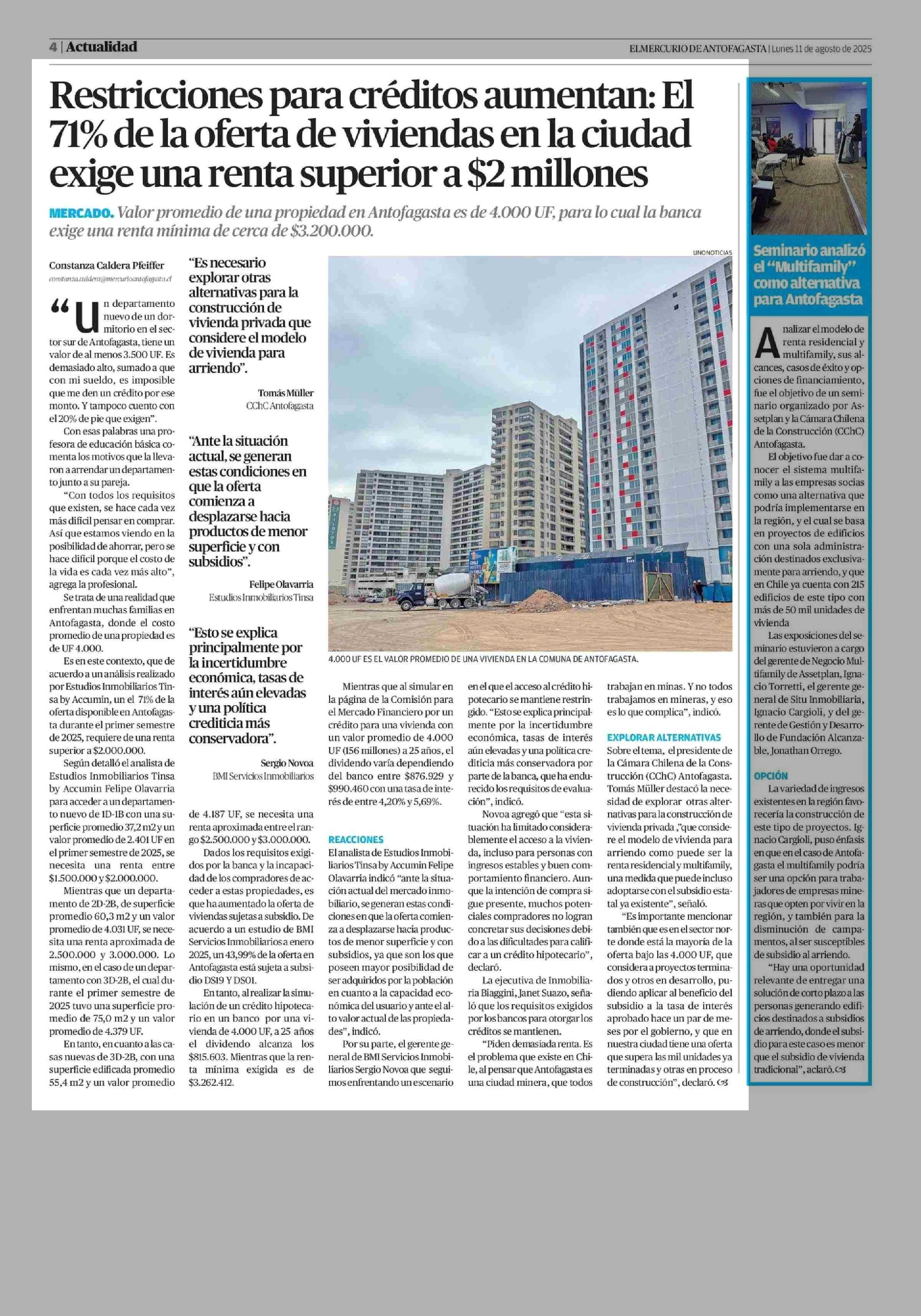 Restricciones para créditos aumentan: El 71% de la oferta de viviendas en la ciudad exige una renta superior a $2 millones 11-08-2025 El Mercurio de Antofagasta |