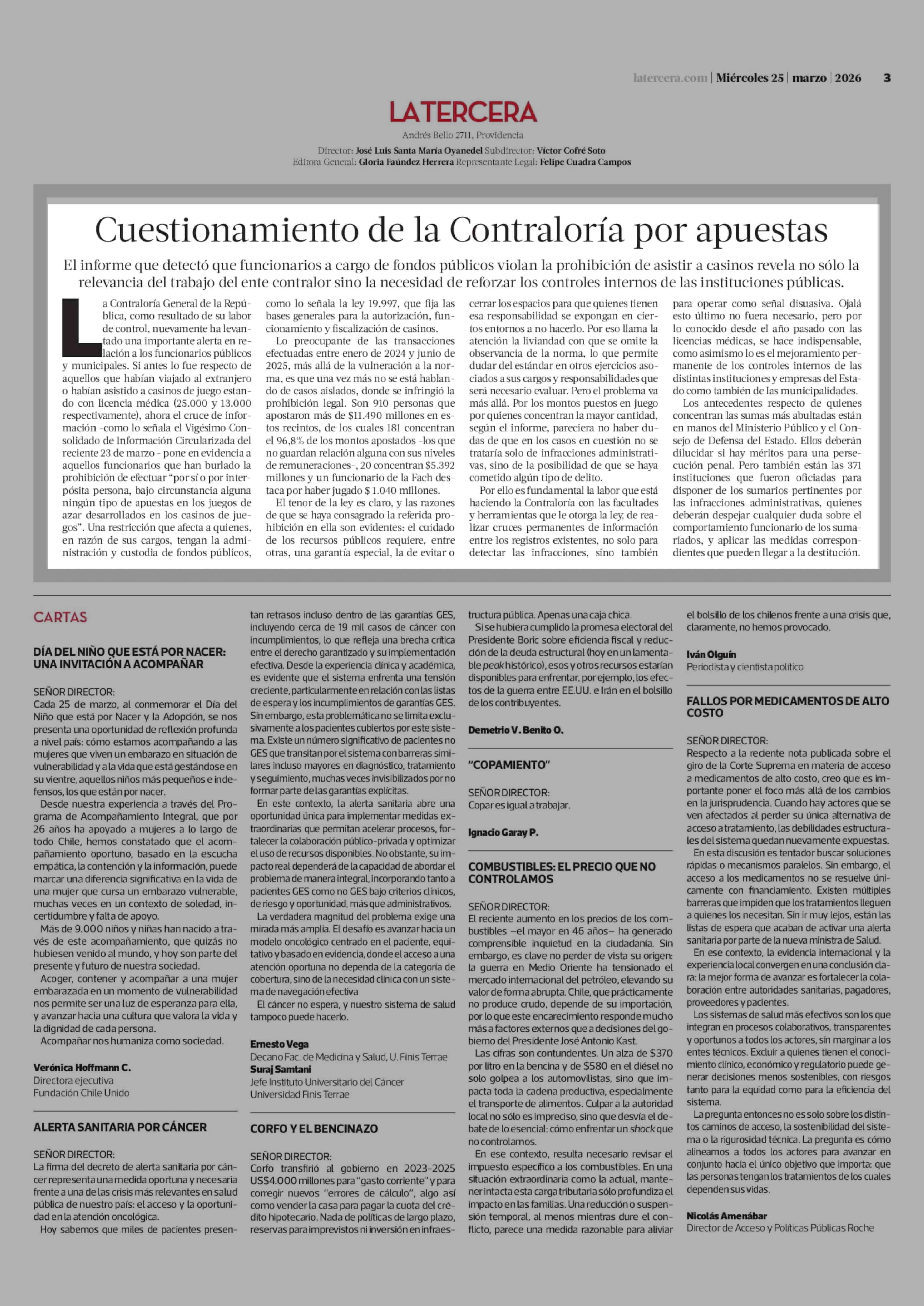 Editorial: Cuestionamiento de la Contraloría por apuestas 25-03-2026 La Tercera |