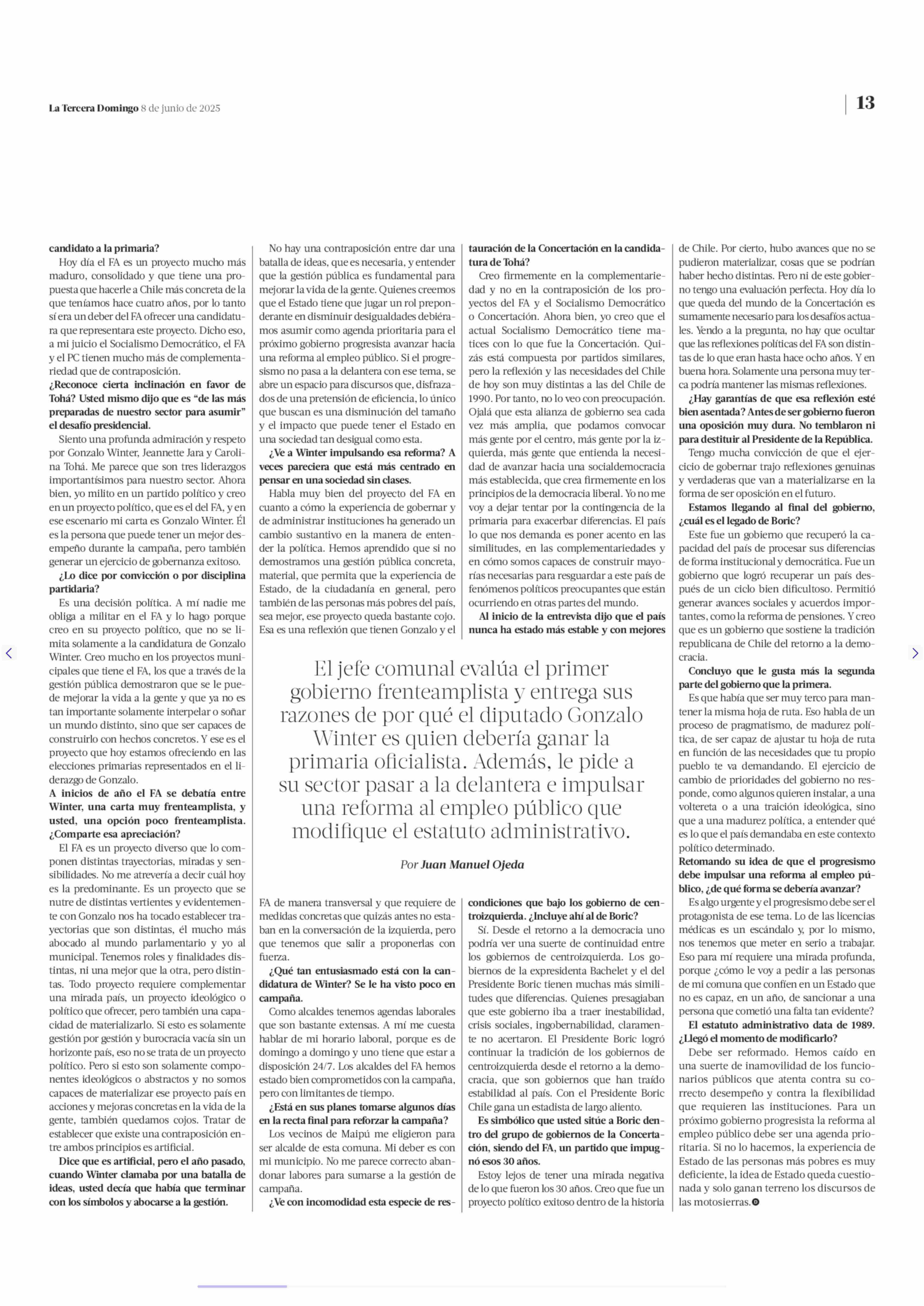 “Boric logró continuar la tradición de los gobiernos de centroizquierda desde el retorno a la democracia” 08-06-2025 La Tercera |