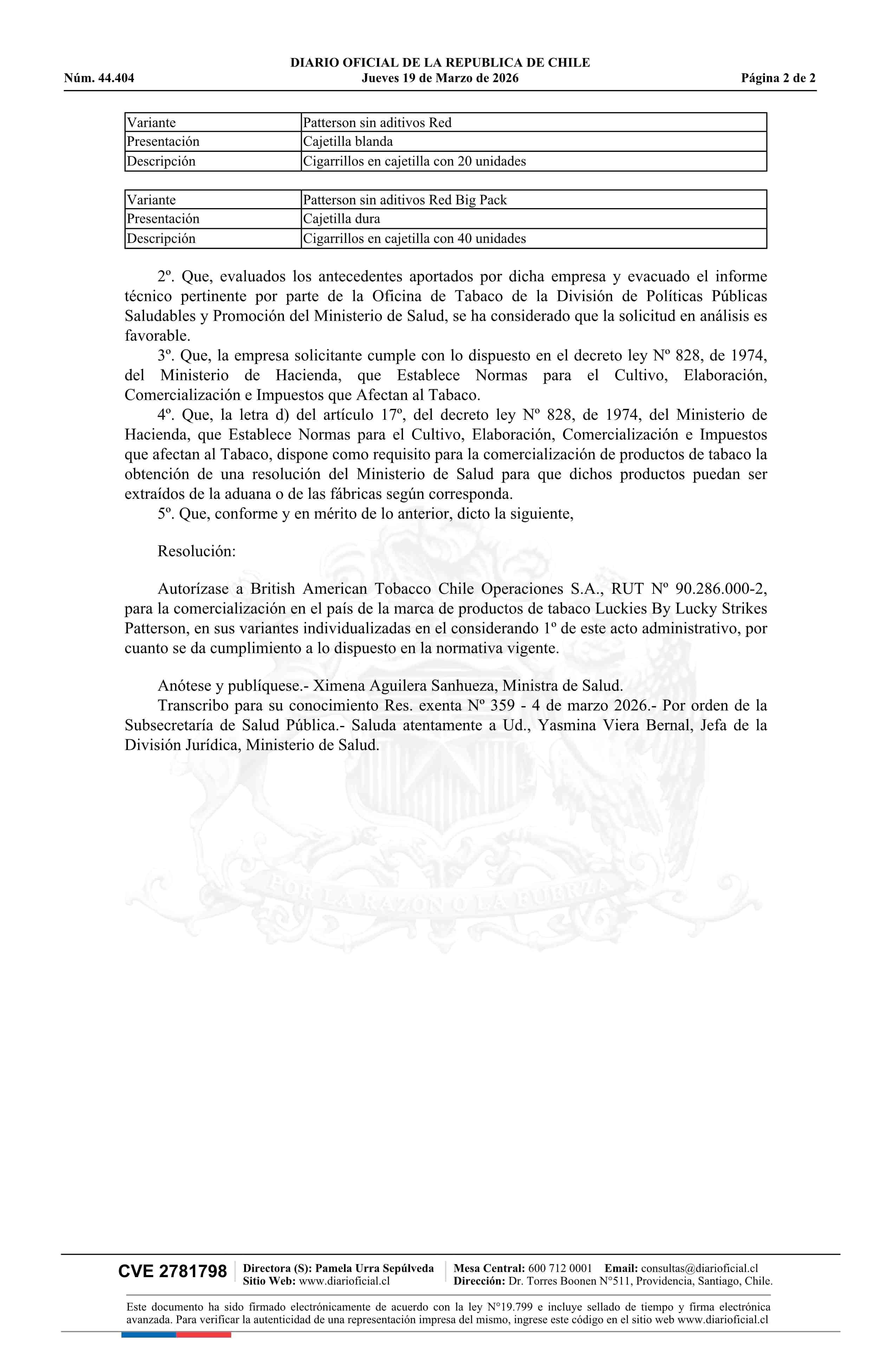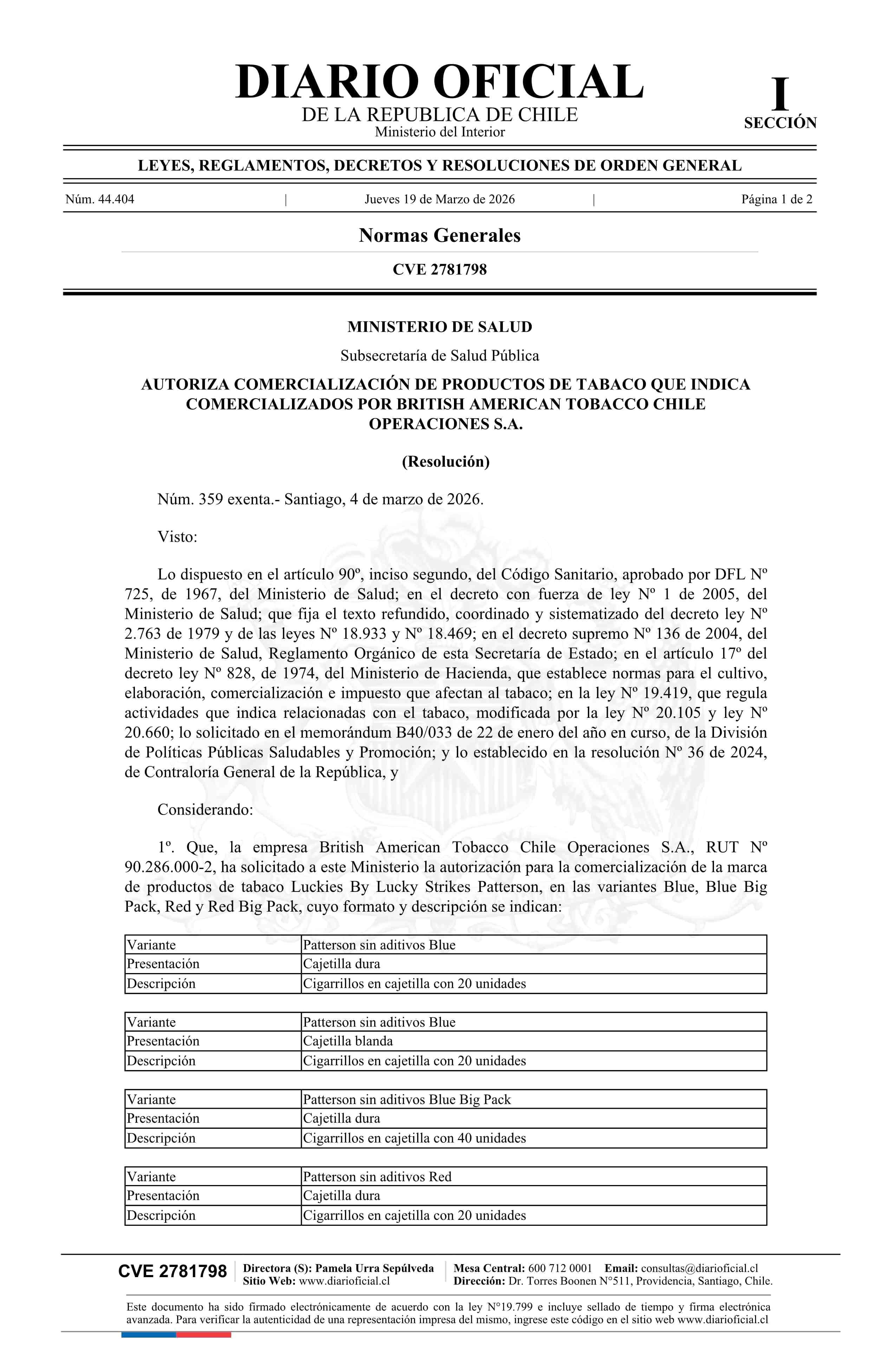 Resolución exenta número 359, de 2026.- Autoriza comercialización de productos de tabaco que indica comercializados por British American Tobacco Chile Operaciones S.A. 19-03-2026 Diario Oficial Edición Electrónica |