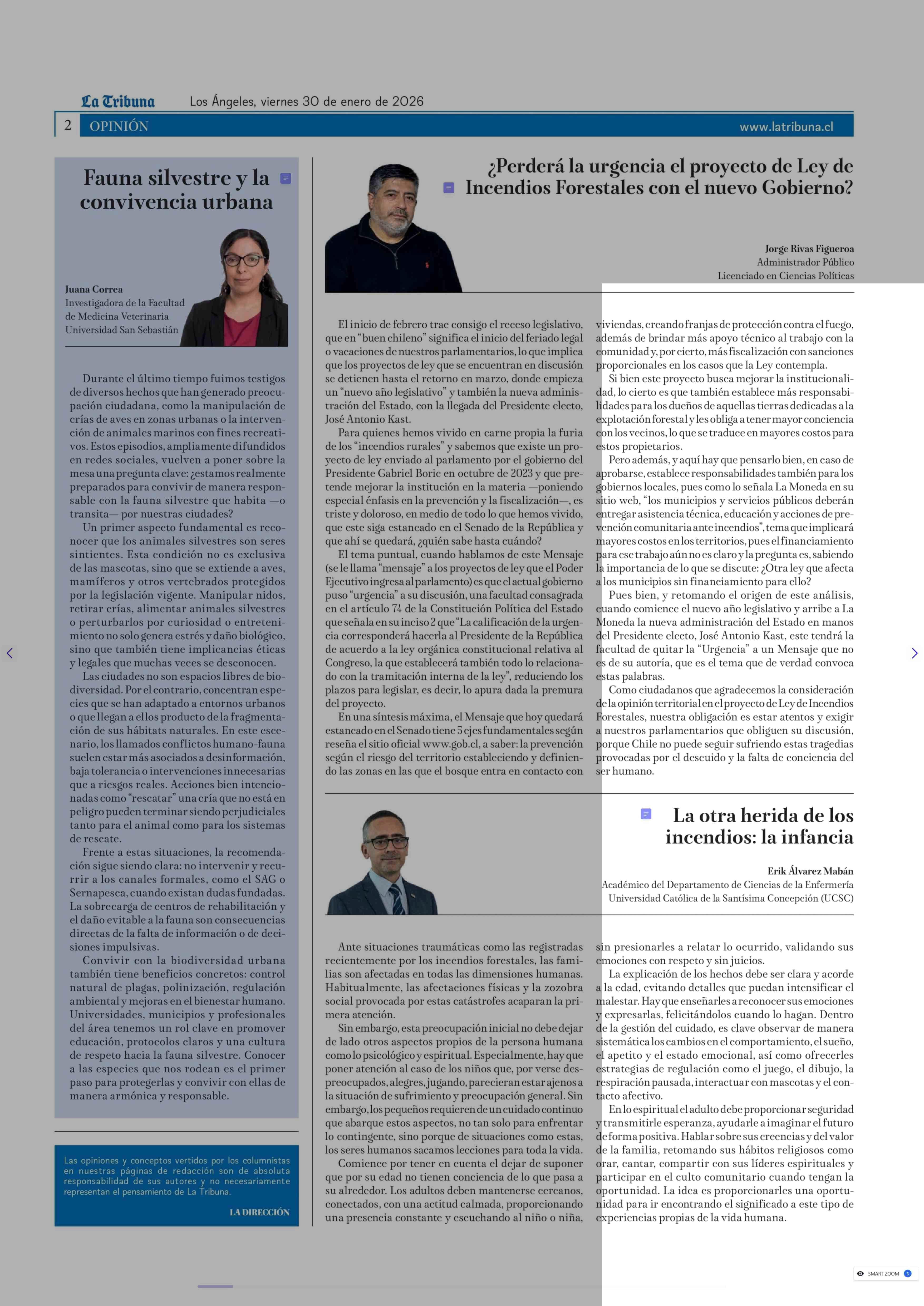 Columnas de Opinión: ¿Perderá la urgencia el proyecto de Ley de Incendios Forestales con el nuevo Gobierno? 30-01-2026 La Tribuna |